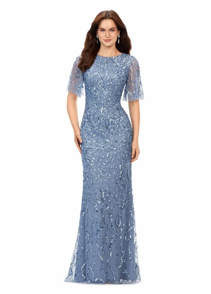 Dazzle at your next event in this elegant gown featuring butterfly sleeves, a keyhole back and sequin beading throughout.
