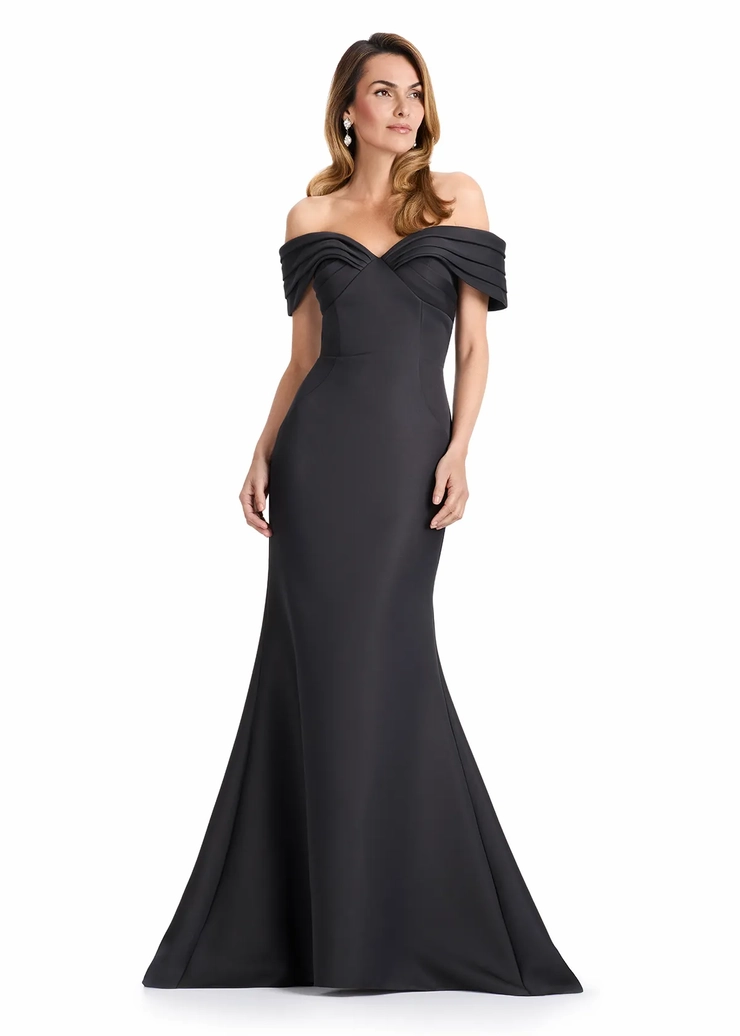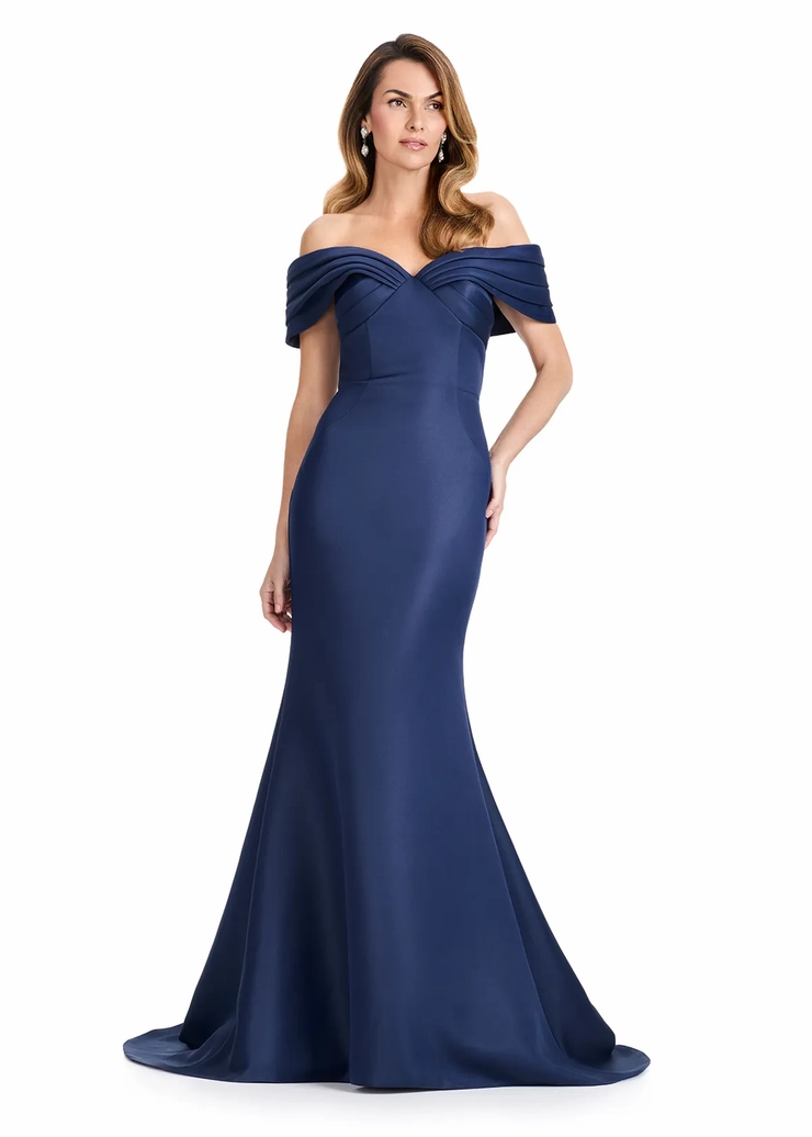 Elevate your occasionwear with ASHLEYlauren’s Style E12097, a sleek off-shoulder evening gown designed to turn heads. This figure-hugging dress features a pleated sweetheart neckline, dramatic off-shoulder sleeves, and elegant satin finish. A row of covered buttons trails down the back, adding timeless sophistication.