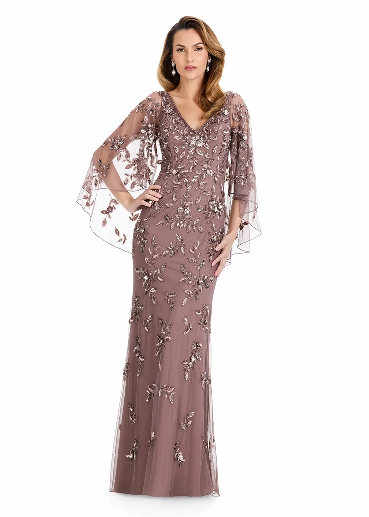 Add graceful drama to your next formal event in the ASHLEYlauren Style E12128. This fully beaded gown features soft, flowy bell sleeves and a flattering V-neckline. The elegant sheath silhouette is embellished with delicate beading from top to hem, creating a shimmering finish that’s both sophisticated and eye-catching.