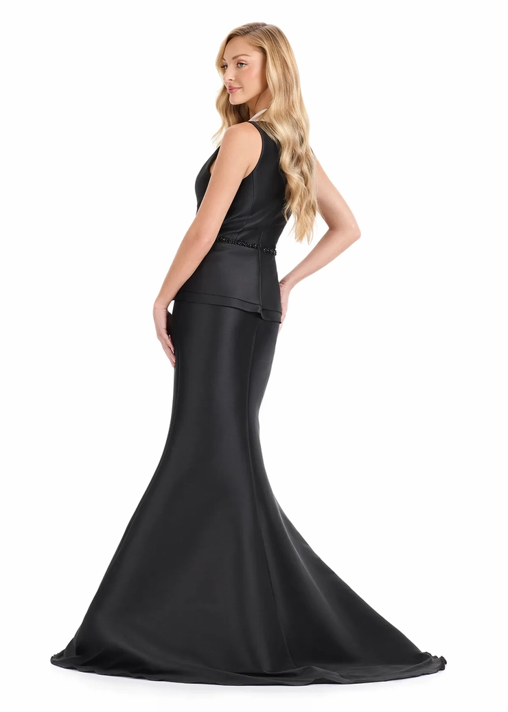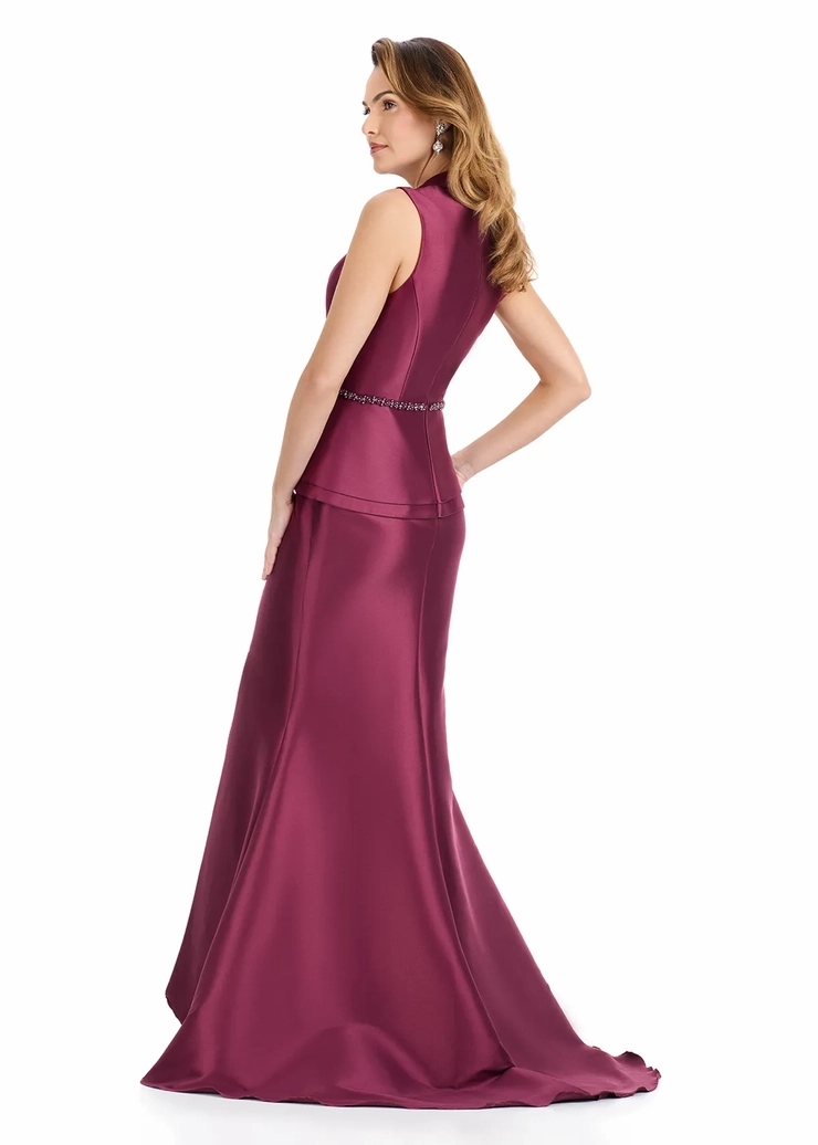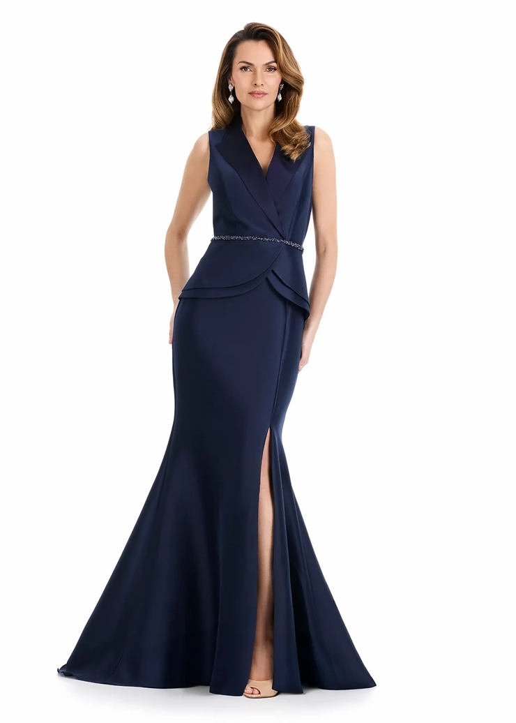 Bold, modern, and beautifully tailored, the ASHLEYlauren E12131 redefines classic elegance with a runway twist. Crafted in sculpting Mikado, this tuxedo-inspired evening gown features a sleeveless blazer-style bodice with sharp lapels, a crystal belt at the waist, and a layered peplum detail. The structured mermaid silhouette flares with a front slit, delivering red carpet drama and a confident, fashion-forward feel. Perfect for black-tie events, modern mother of the bride looks, or any high-glamour occasion.