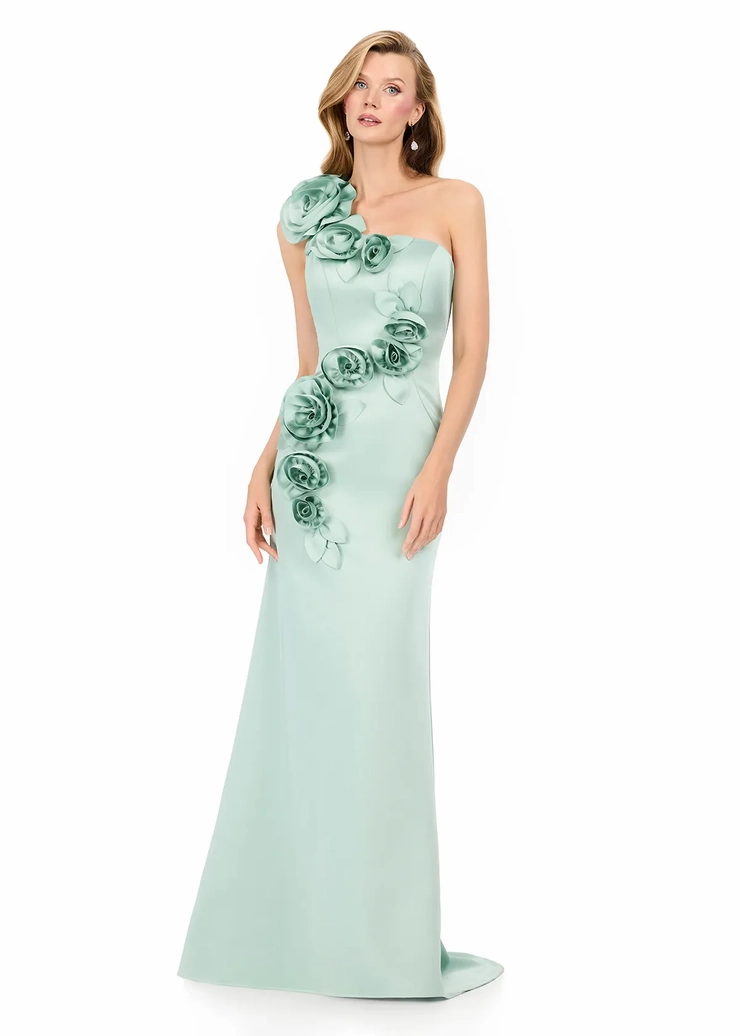 Turn heads and captivate the room in ASHLEYlauren Style E12159, a couture-inspired one-shoulder satin gown adorned with cascading 3D floral appliqués. This glamorous design blends sculptural elegance with modern sophistication, creating a breathtaking silhouette perfect for elevated formal moments.