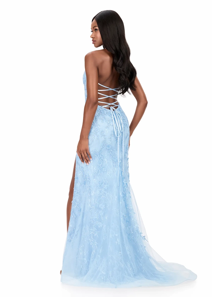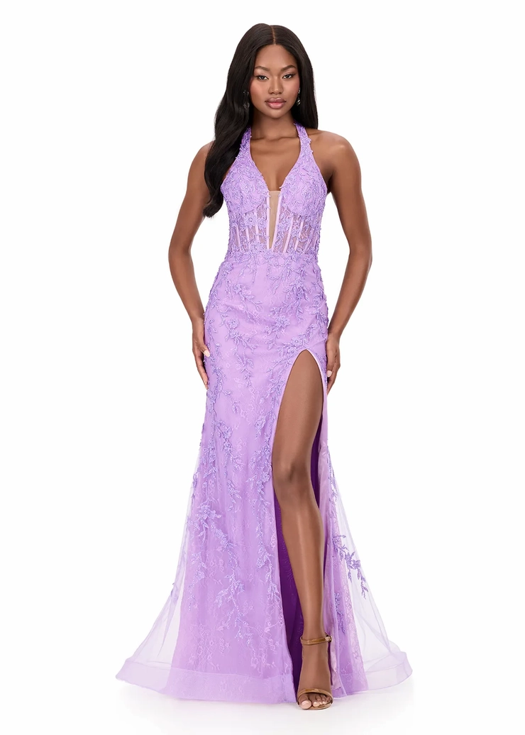 This striking lace applique gown features a deep V-neckline with illusion cutouts and a thigh-high slit for added drama. The fitted bodice laces up in the back, creating a flattering, adjustable fit that accentuates your curves. ASHLEYlauren Style 12156 is perfect for pageant, prom, or any red-carpet moment, this gown radiates confidence and glamour.