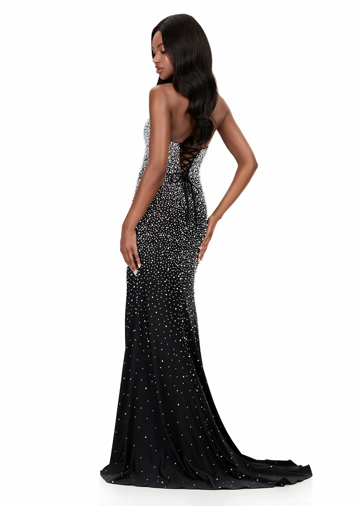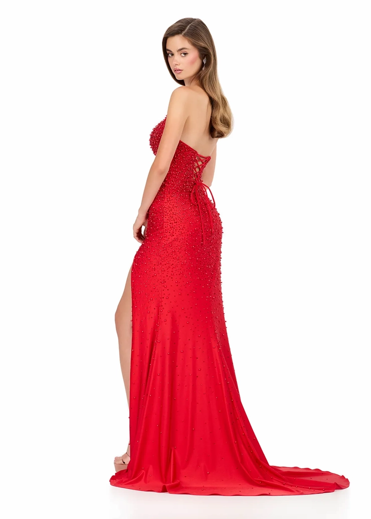 The ASHLEYlauren Style 12181 is a fitted jersey gown with press-on stones and pearls. It is the definition of elegance and sophistication. The sweetheart neckline, thigh-high slit, and lace-up back, combine to create a sleek and sexy silhouette that flatters every curve.