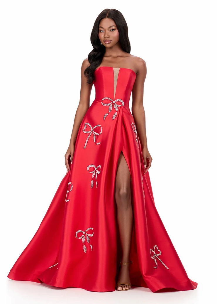 Be bold in this ASHLEYlauren Style 12207 A-Line bow gown. The structured Mikado fabric creates a timeless silhouette, while sparkling crystal and pearl bow embellishments add a touch of playful sophistication. The illusion plunge neckline and full skirt make this gown a show stopper.