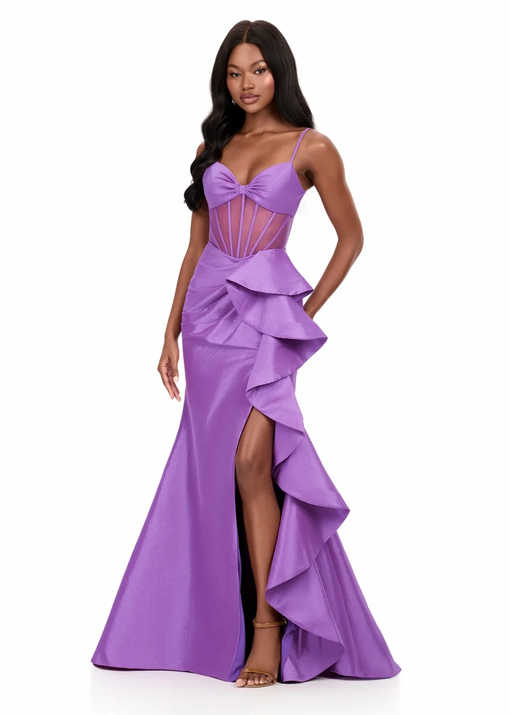 Make a bold fashion statement in this sultry ASHLEYlauren Style 12213 taffeta gown. The sheer corset bodice with exposed boning gives a modern, daring edge, while the ruffled detail on the skirt adds a touch of drama. Designed to flatter every curve, this gown is the perfect mix of sophistication and allure.