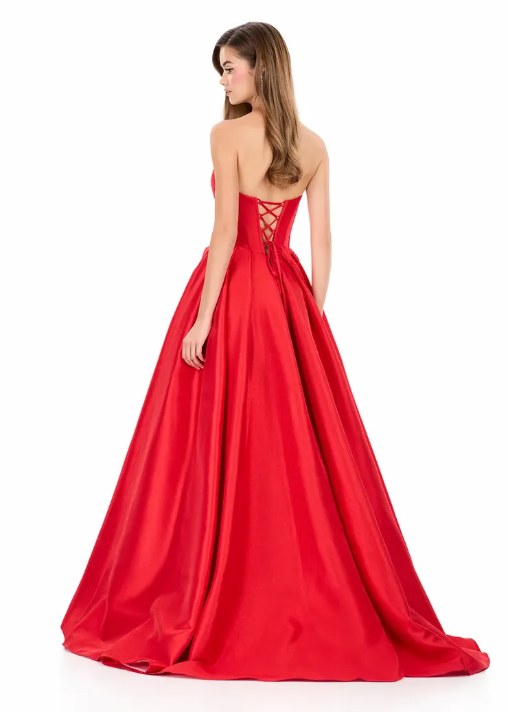 Bold and elegant, ASHLEYlauren Style 12266 is a Mikado ball gown designed to deliver dramatic volume with a modern twist. The strapless sweetheart bodice features structured seaming that sculpts the waist, while the full skirt opens into a front slit that adds movement and a touch of edge. A lace-up back ensures a customizable fit, enhancing the gown’s beautifully tailored silhouette. Perfect for making a striking and sophisticated entrance.