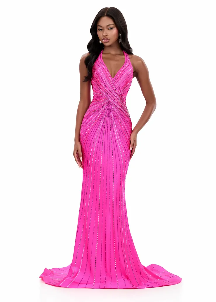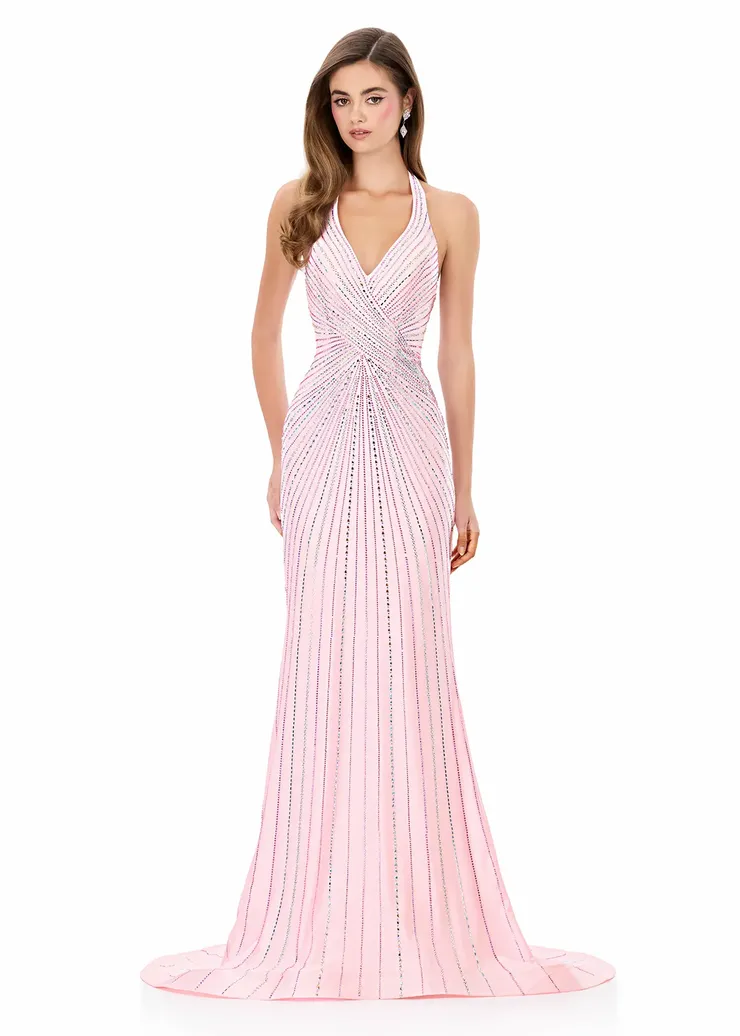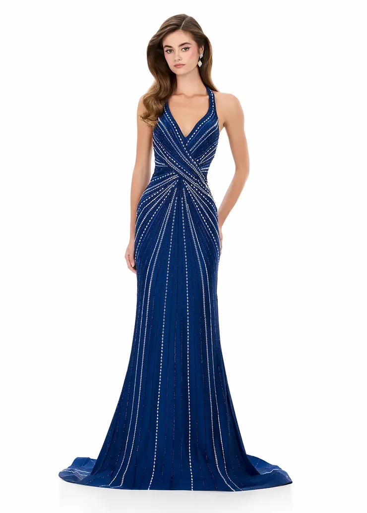 Be Sophisticated and striking in this fully beaded design that radiates from the bodice down the skirt, creating a slimming, high-impact silhouette. The jersey fabric of ASHLEYlauren Style 12327 sculpts the body comfortably, while the open back and sweeping train elevate the glamour. A perfect mixture of sparkle and structure for a show-stopping entrance.