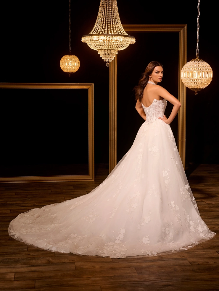 Ball gown with floral lace motifs and split on side skirt.