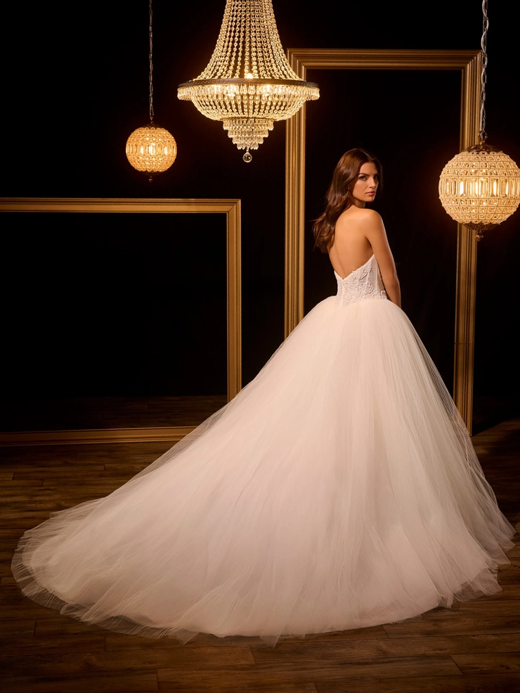 Ball gown with permanently pleated tulle on skirt and beaded lace on the bodice with pointy front neckline. Buttons/zipper back closure.