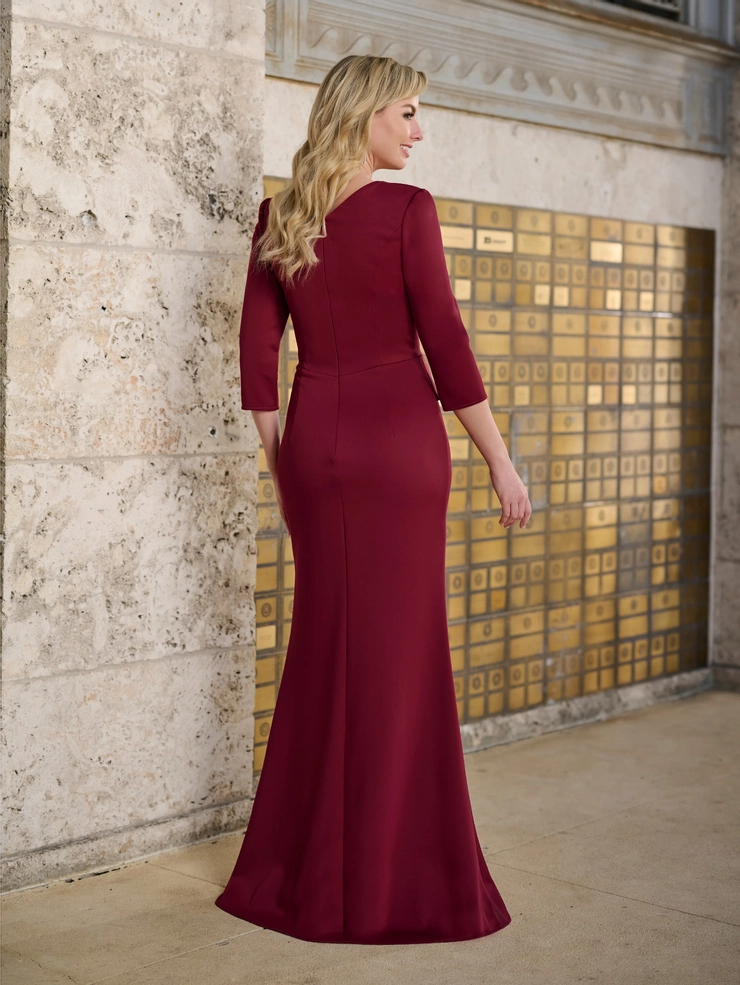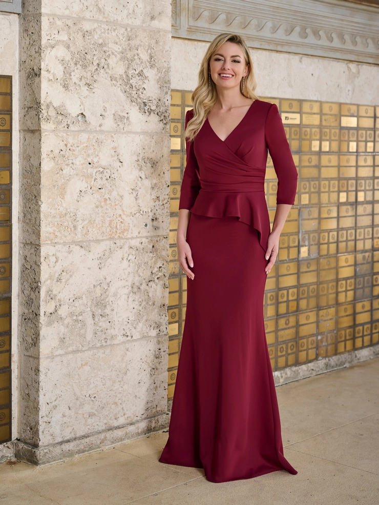 Slim style in scuba like jersey fabric, has V-neck, side draping and peplum on front skirt. Invisible zipper back dress closure, short sweep train.