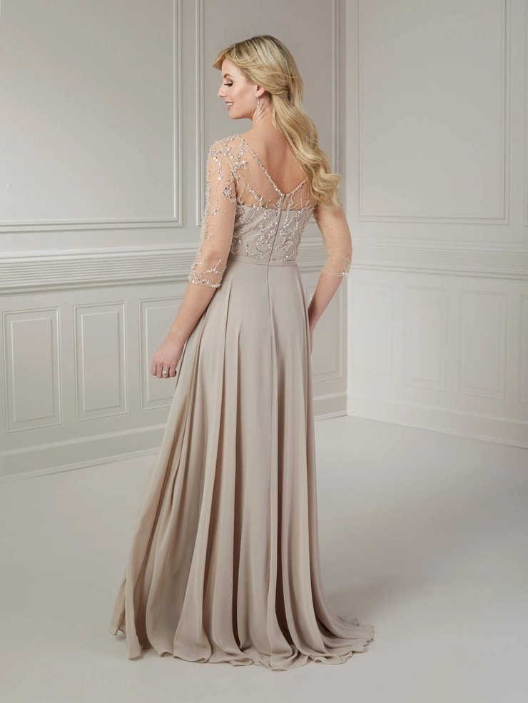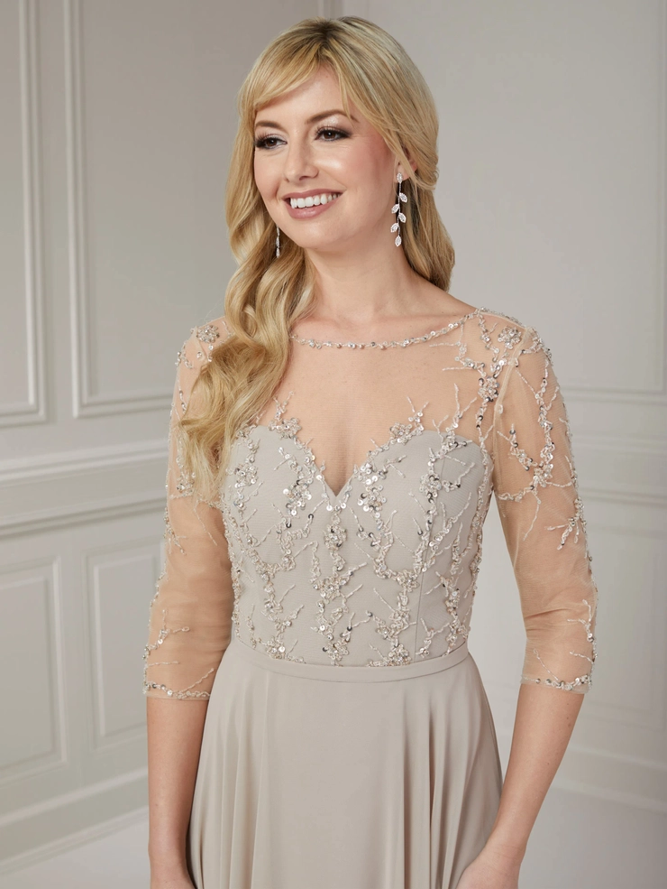 Timeless elegance is revealed in this long A-line flowing silhouette made of chiffon with a sweetheart neckline. This showstopping gown features a delicate sheer illusion beaded tulle overlay bodice with a high scoop neck and three-quarter length sleeves. A banded waist for added definition leads to a full sweeping skirt.