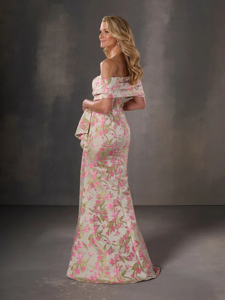 A floral brocade fit and flare gown with asymmetrical peplum falling into a draped side ruffle. This gown comes with a removable wrap.