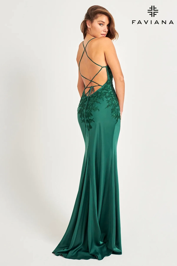 Long Matte Satin V-Neck Dress Featuring Applique With A Lace-Up Back And An Invisible Zipper With Hook & Eye Closure.
