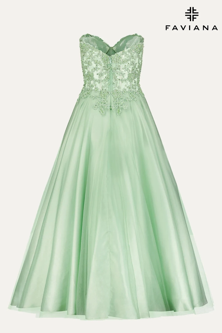 Long Tulle Strapless Dress Featuring Applique Corset Bodice With Full Skirt With A Slit And An Invisible Zipper With Hook & Eye Closure.
