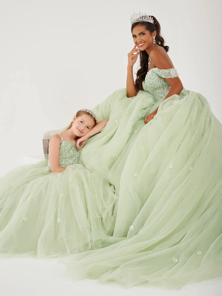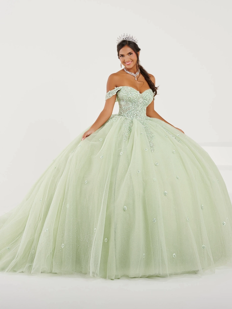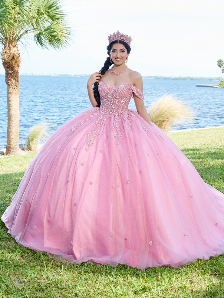 Show off your inner princess in our gorgeous off the shoulder ball gown with 3D beaded lace bodice and pleated. The full ball gown skirt is crafted of gathered tulle and is sparkled with glitter and 3d lace flower. Lace-up back and train. Matching mini Quince: 13749.