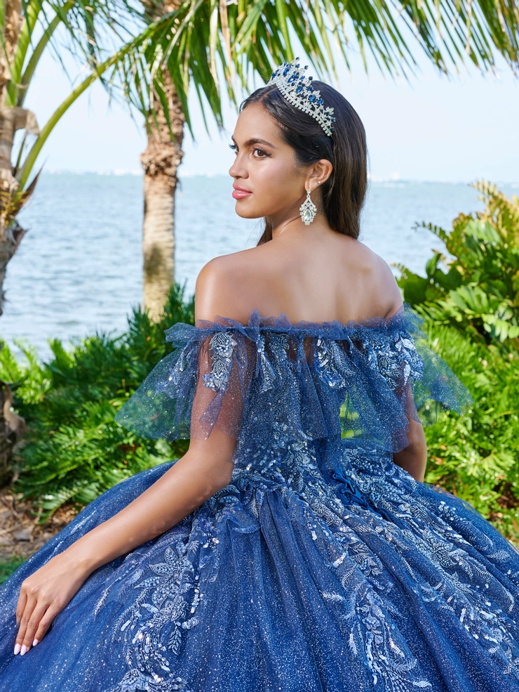 Sweetheart off the shoulder neckline, beaded sequin lace Illusion bodice with corset. Multiple glitter tulle ball gown skirt with lace detail appliques. Lace-up back and sweep train with matching shawl.