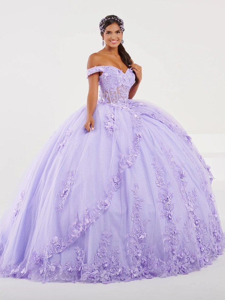 Off-the-shoulder quinceanera ball gown features a sweetheart neckline, straps with 3D lace appliqué, an illusion bodice with intricate embroidery with multiple layers of tulle skirt with three-dimensional embroidery framing the petal ball gown skirt finished with a border lace and lace-up back.