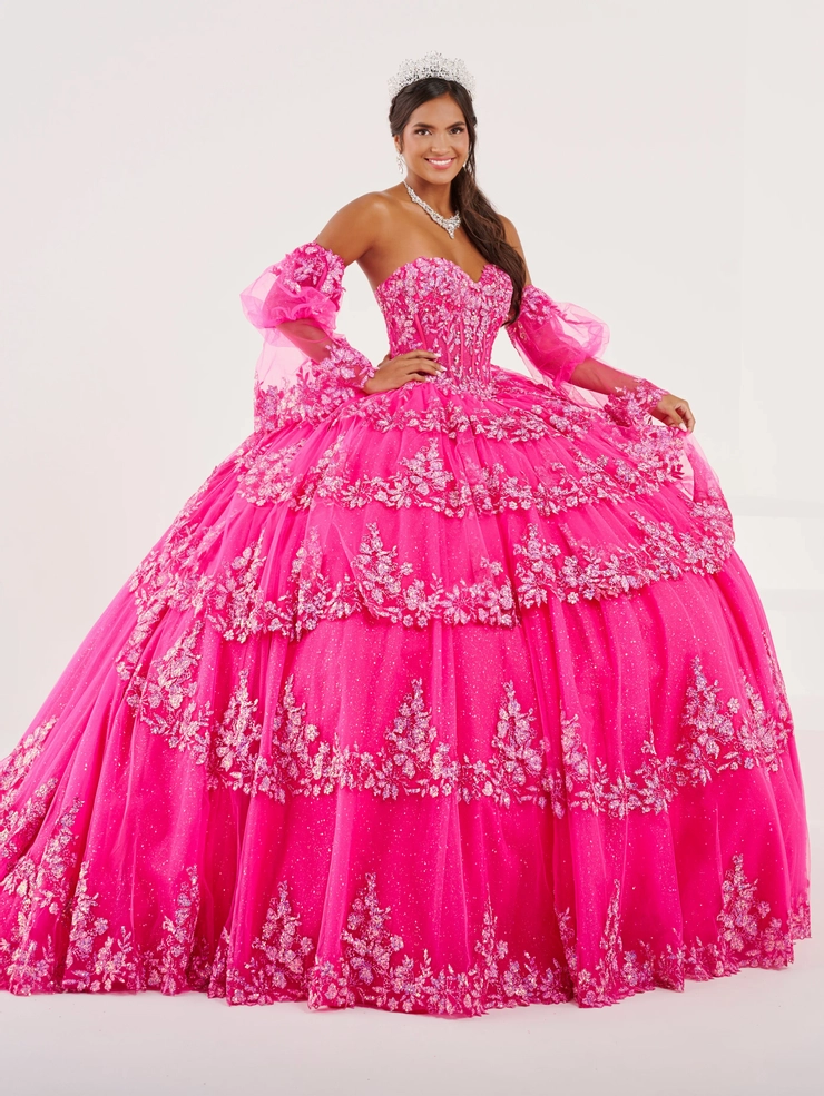 Sweetheart strapless corset bodice. Fully glitter floral lace detail with Multiple glitter lace appliques edges, detachable puffy bell sleeves. Lace-up back and sweep train. Matching mini Quince: 13738.
