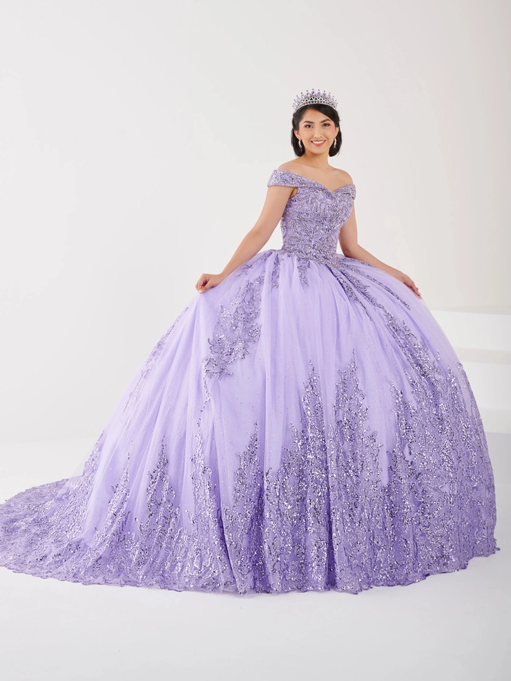 Sweetheart strapless, lace appliques with pleated bodice, layers of tulle ball gown skirt with lace and butterfly embroidery detail. Lace-up back and sweep train. Matching puffy flowy long sleeve.
