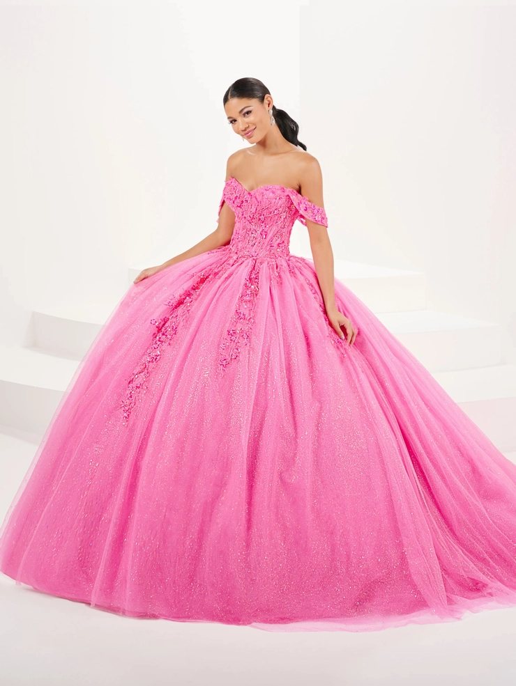 Sweetheart scoop neckline with off shoulder straps, sequins lace glitter appliques bodice and pleated tulle. Multiple glitter tulle with sequin appliques ball gown tulle skirt. Lace-up back and sweep train.