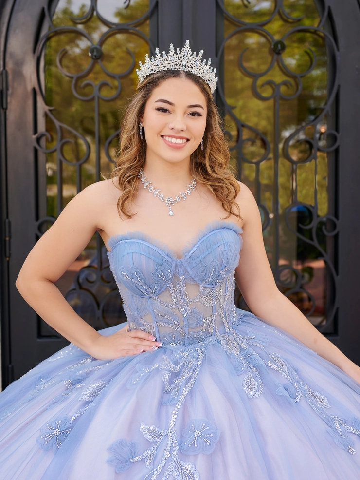 This beautiful fairytale Quinceañera ball gown has a corseted bodice with hand-draped tulle on the cups and delicate ruching trims around the neckline. 3-dimensional tulle floral appliqués are added to the sheer bodice and the skirt to create a whimsical effect.