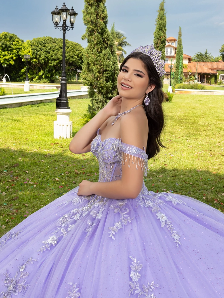 This gorgeous Quinceanera ball gown features a crystal beaded corset bodice adorned with delicate three-dimensional floral embroidered appliqués. The classic corset sweetheart neckline is perfect for any shape or size. Detachable off-the-shoulder sleeves feature crystal tear drops for a touch of drama. The glitter tulle skirt adds the perfect sparkle to complete this look.
