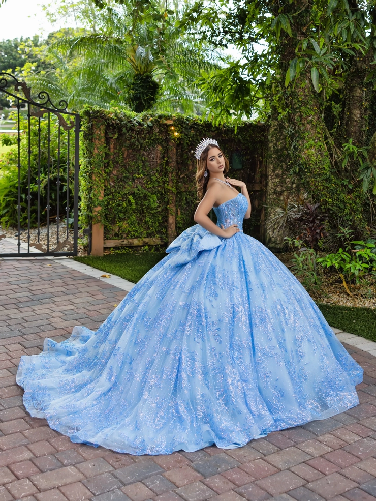 This classic sweet neckline Quinceanera ball gown features the ultimate sparkle moment. Glitter lace applique takes over the entire gown to make a glistening statement. A gorgeous bow is added to complete this look.