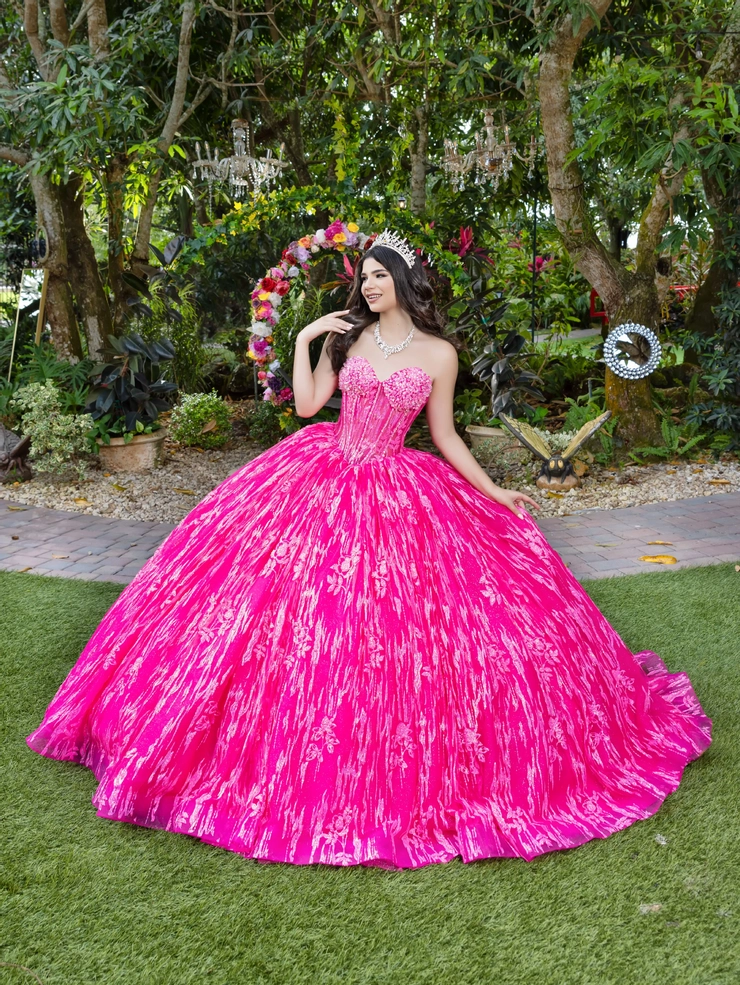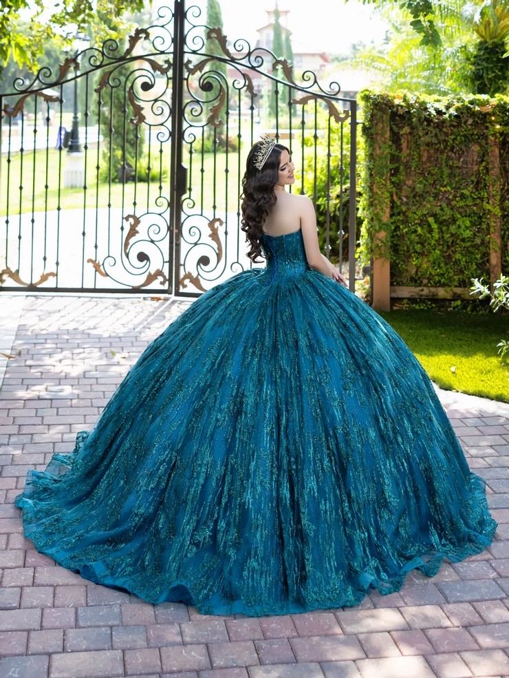 This modern Quinceanera ball gown gives you the ultimate sparkle moment. The floral glitter tulle is accentuated with additional beading. Crystal beads are added to the bodice corset boning for a touch of drama.