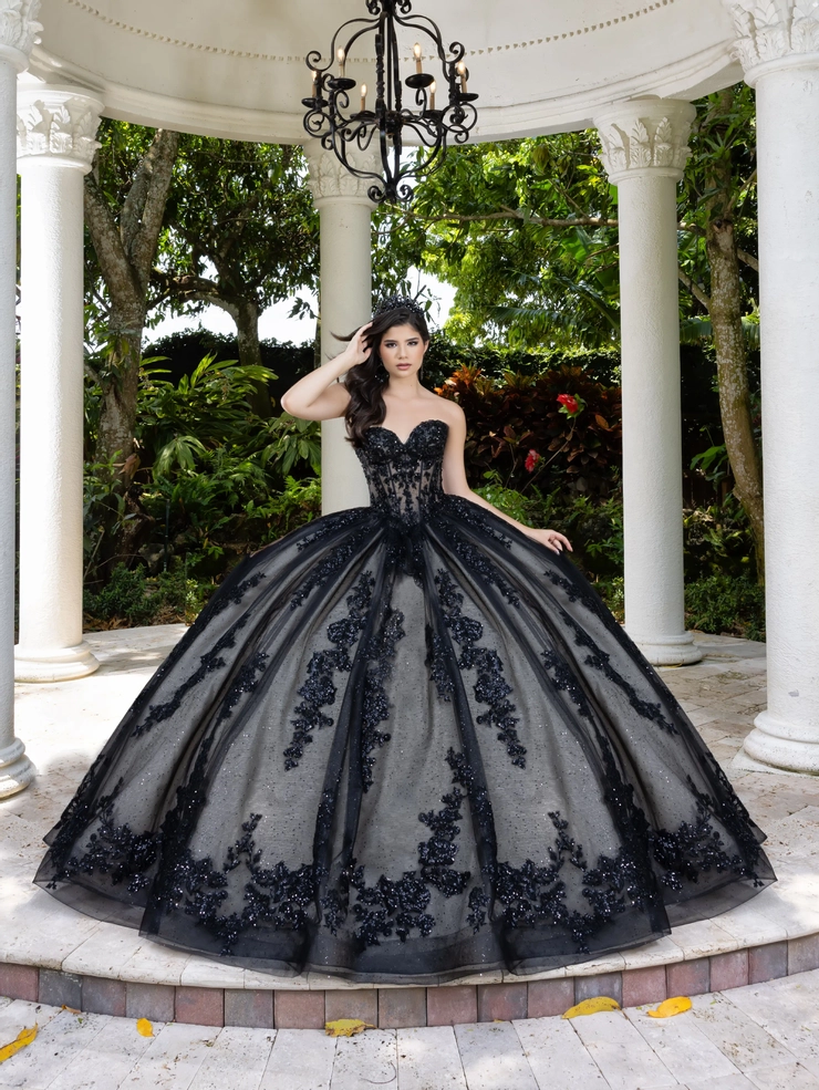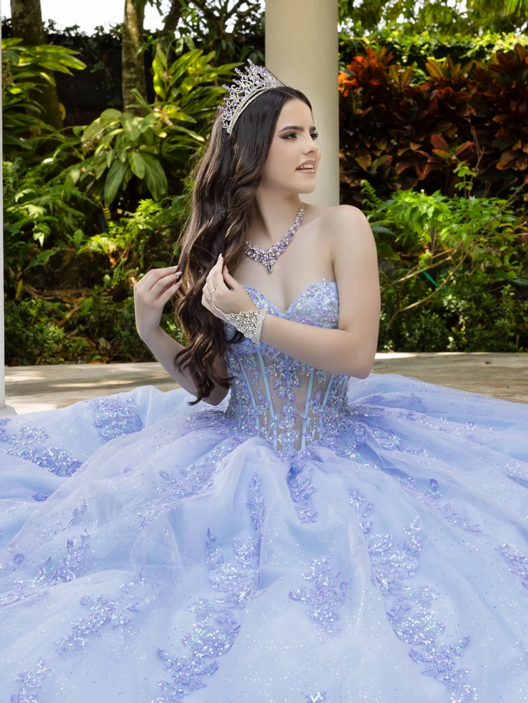 Spectacular Quinceanera ball gown featuring bold lace appliqué. The bodice has boning construction over a sheer bodice. The entire dress is adorned with statement lace to create a unique masterpiece.
