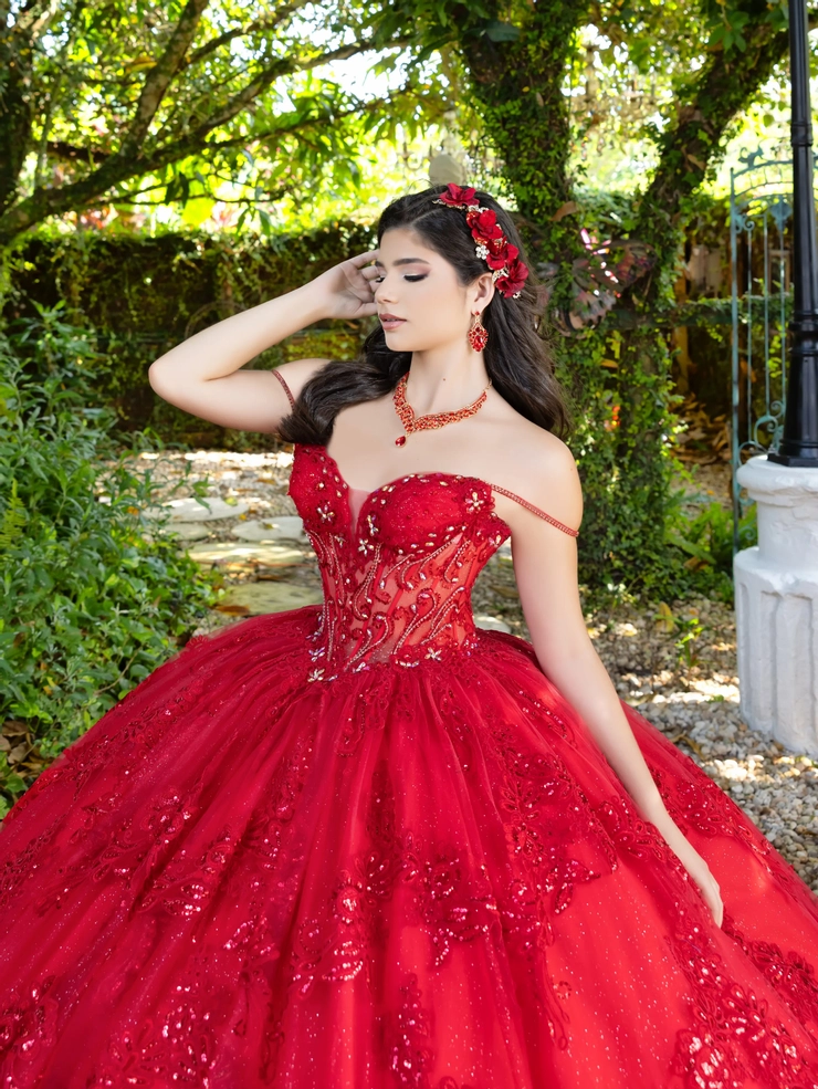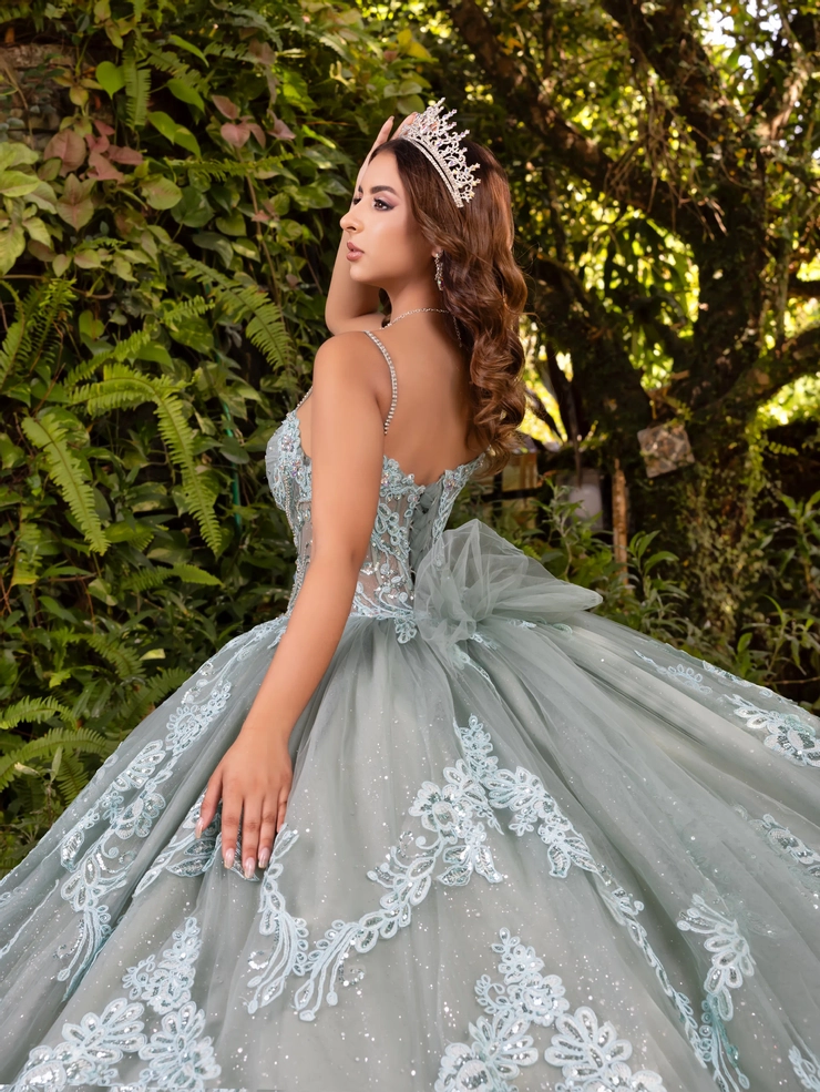 This modern Quinceanera gown features delicate spaghetti straps and a sheer corset bodice with stunning lace applique. The full ball gown skirt showcases a beautiful floral lace applique for a dramatic statement. The bottom hem features a contemporary ruffle design that extends all the way down the train.