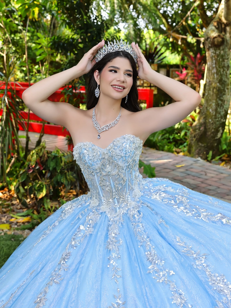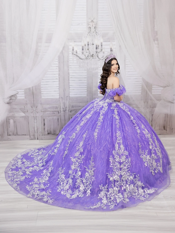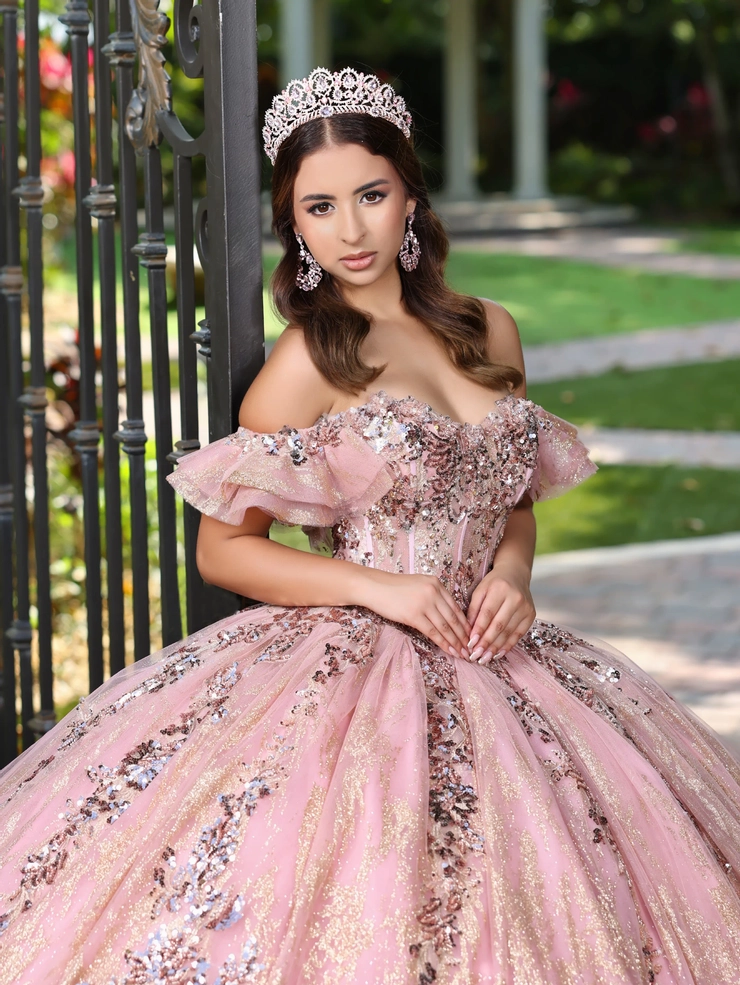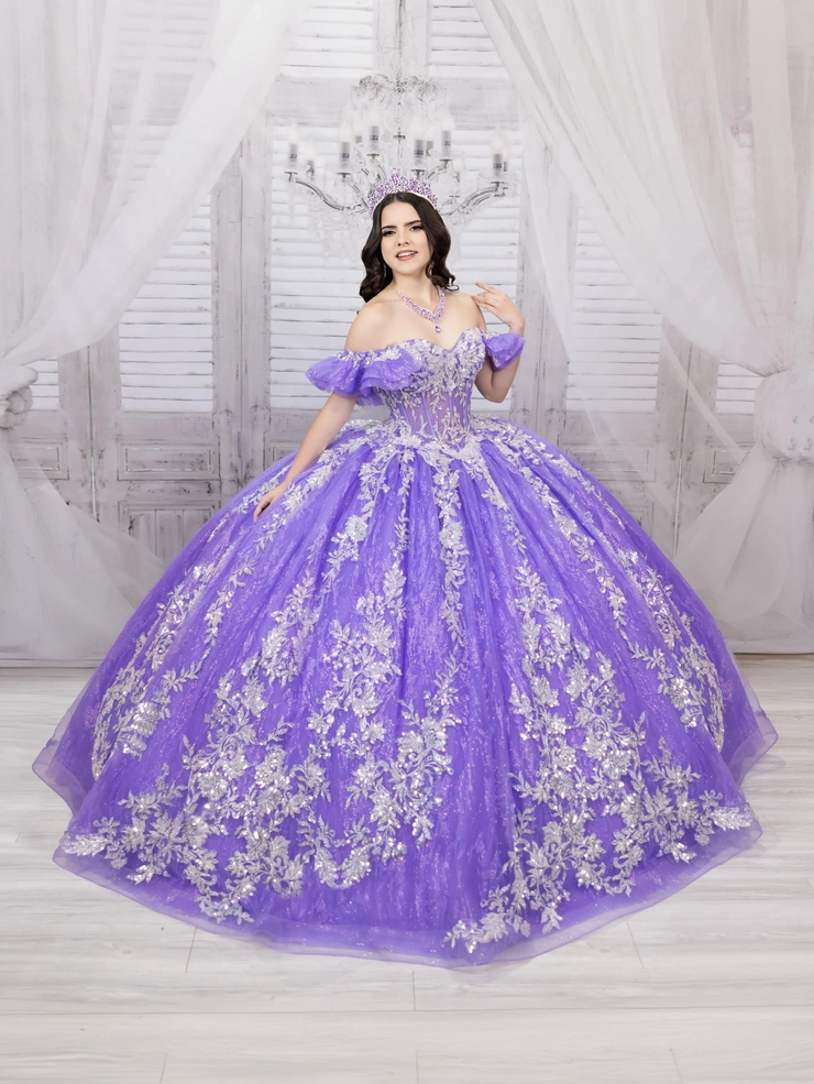 This traditional Quinceanera gown is the perfect choice for your special day. The sheer, corseted bodice is covered in sparkling floral lace appliqué. The double ruffle off-the-shoulder detachable sleeves add excitement to this classic look. The glittery full ball gown skirt features all-over lace placements to create a stunning moment.