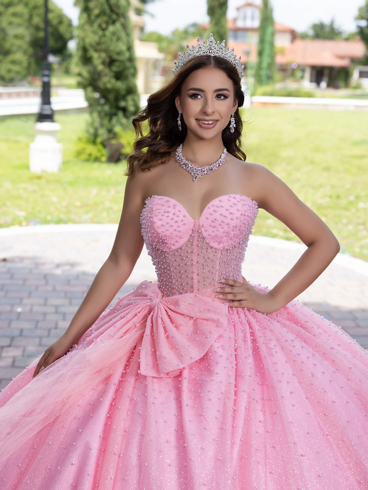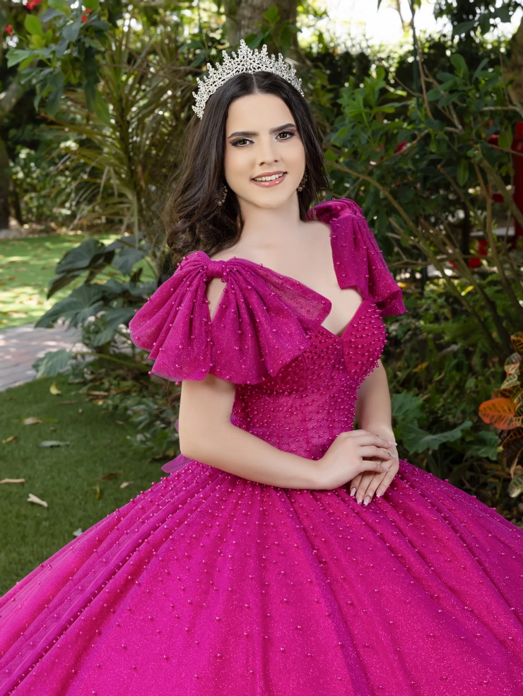 This stunning Quinceanera dress is the perfect choice for those who adore a pearl fantasy. The classic quince gown is fully adorned with matching-colored pearls, and statement shoulder bows are added to complete the look.