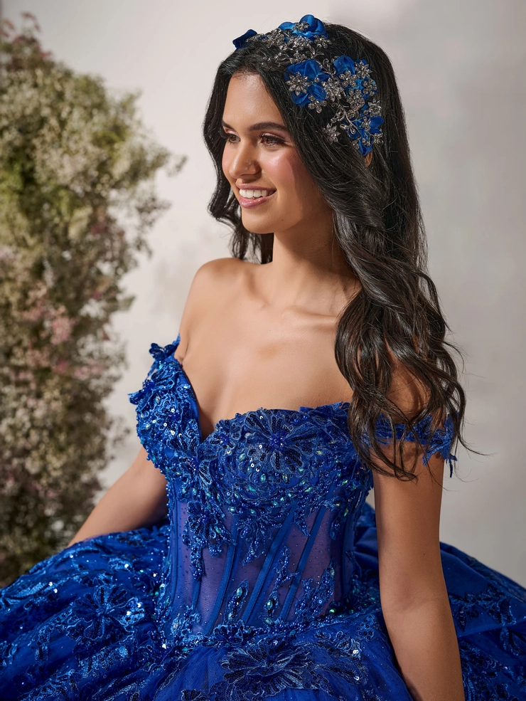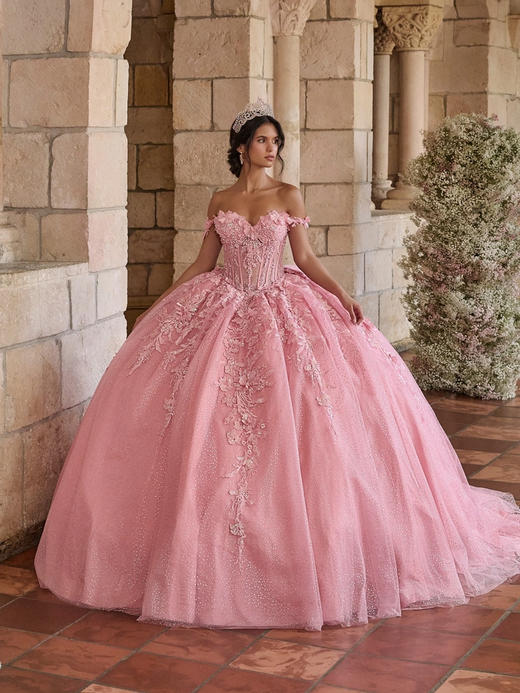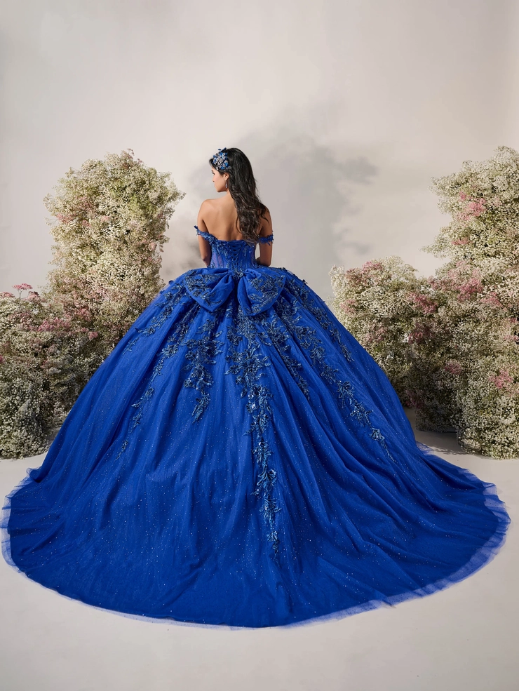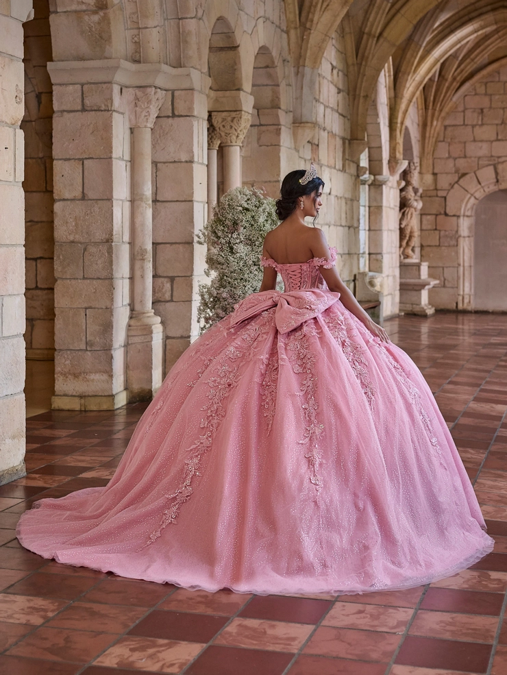 A dazzling ball gown featuring an off-the-shoulder sweetheart neckline, a structured corset bodice adorned with intricate floral appliqués, and an oversized detachable bow for added drama. The voluminous sparkle tulle skirt shimmers with every step, creating an unforgettable fairytale look fit for royalty. Sparkle Tulle/Tulle