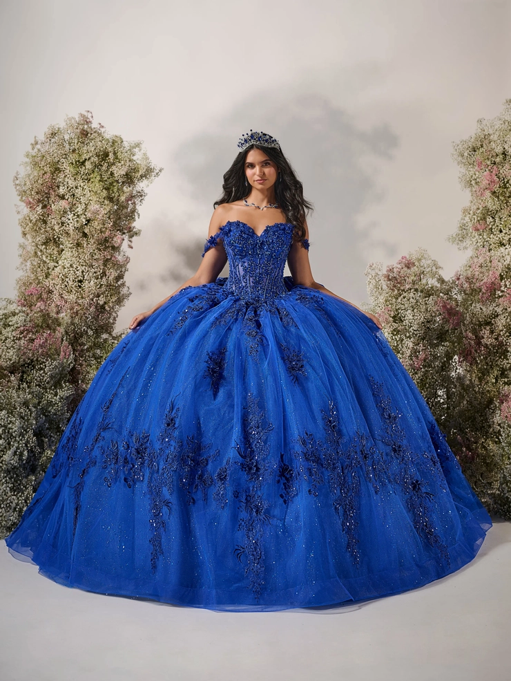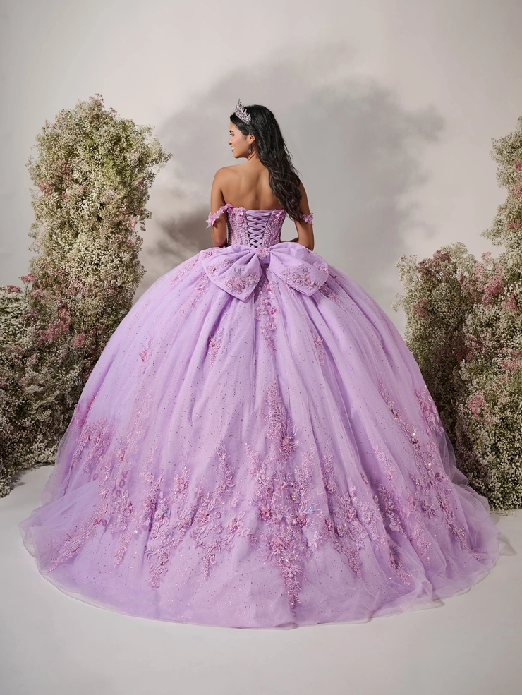 Turn heads in this enchanting ball gown, designed with a delicate sweetheart neckline, off-the-shoulder floral straps, and a structured corset bodice for a flawless fit. The shimmering glitter tulle skirt, adorned with cascading embroidered appliqués, is complemented by an oversized detachable bow for a dramatic and elegant finishing touch. Tulle/Glitter Tulle