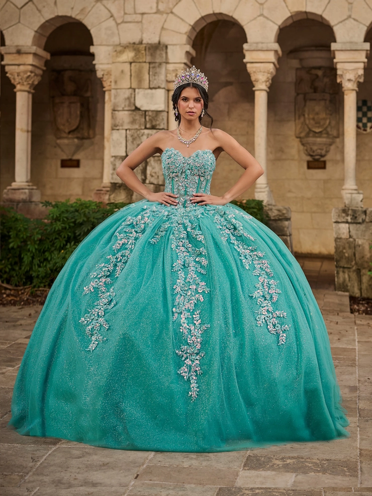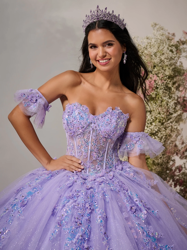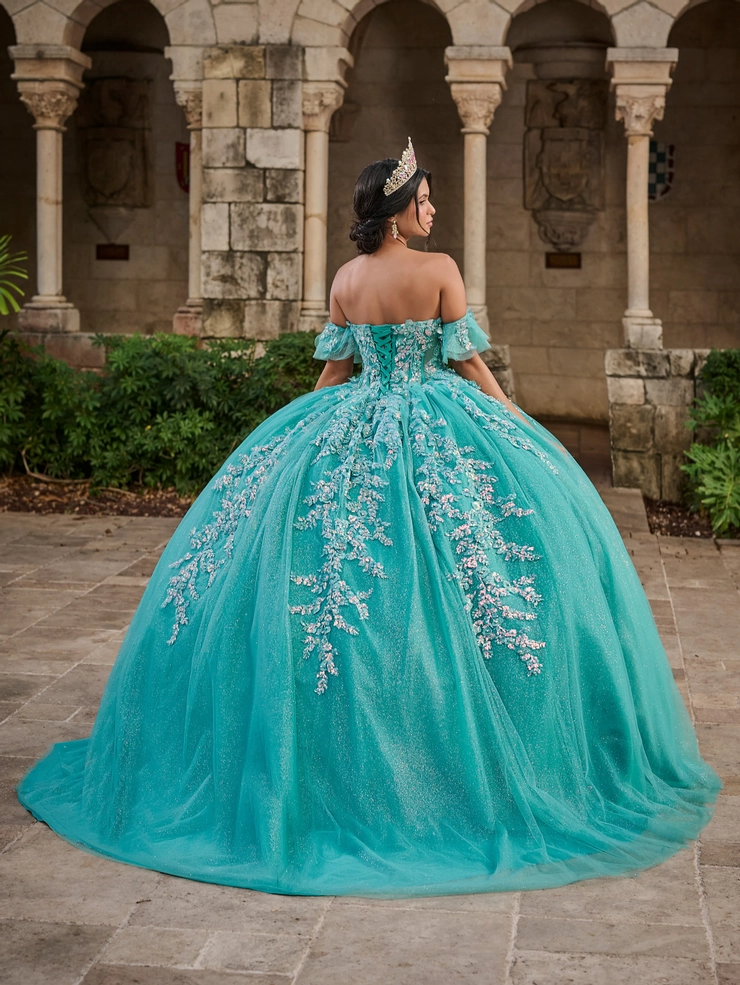Make a grand entrance in this exquisite off-the-shoulder ball gown, featuring a structured corset bodice adorned with shimmering floral appliqués. The voluminous sparkle tulle skirt cascades beautifully, while the detachable sleeves offer versatility for a custom look. Sparkle Tulle/Tulle