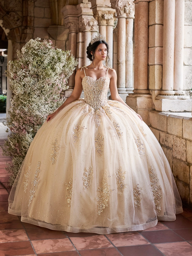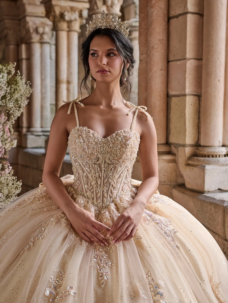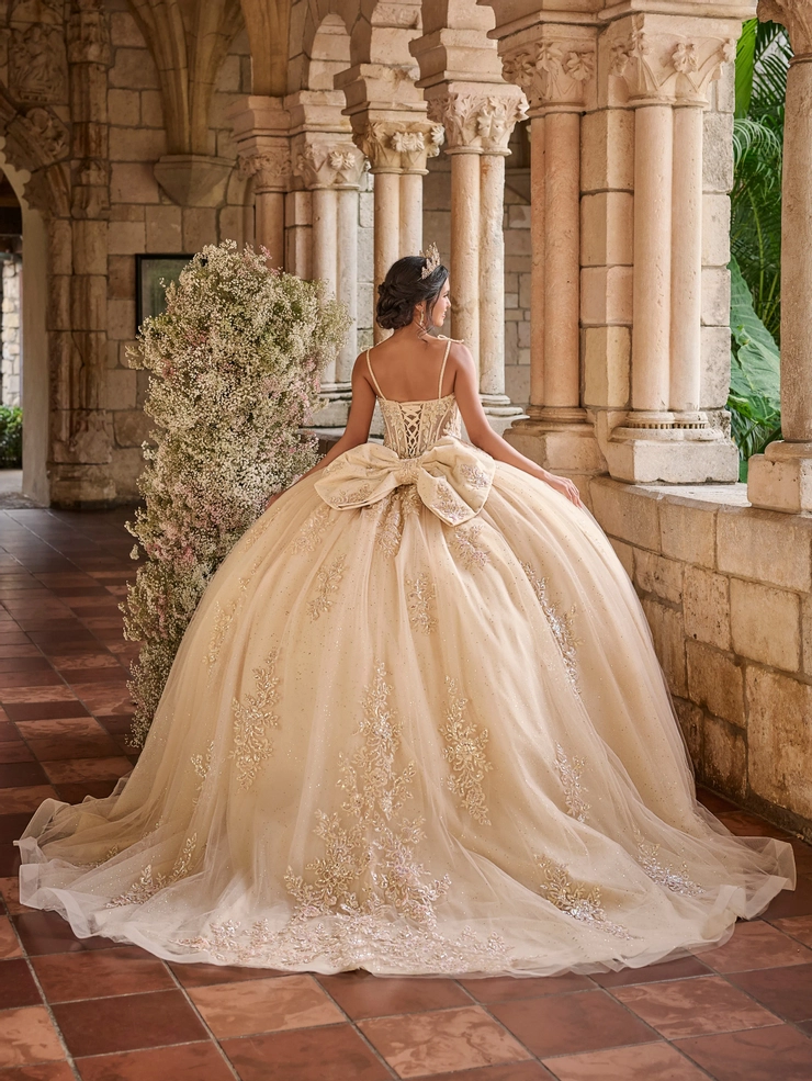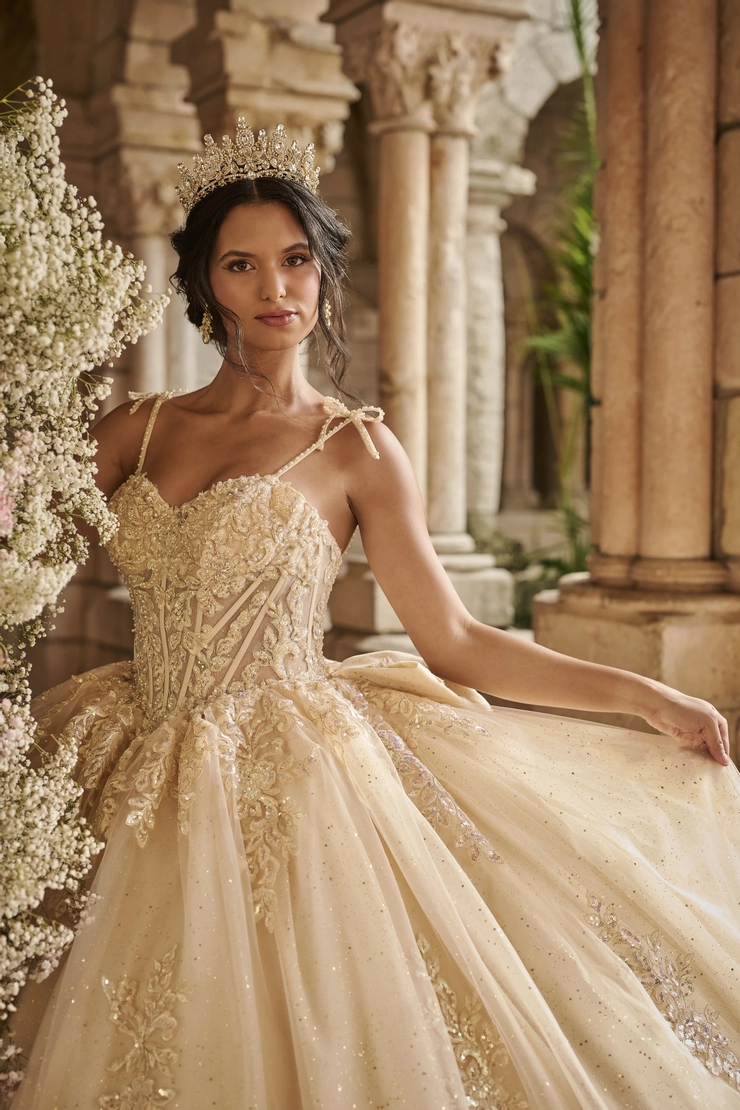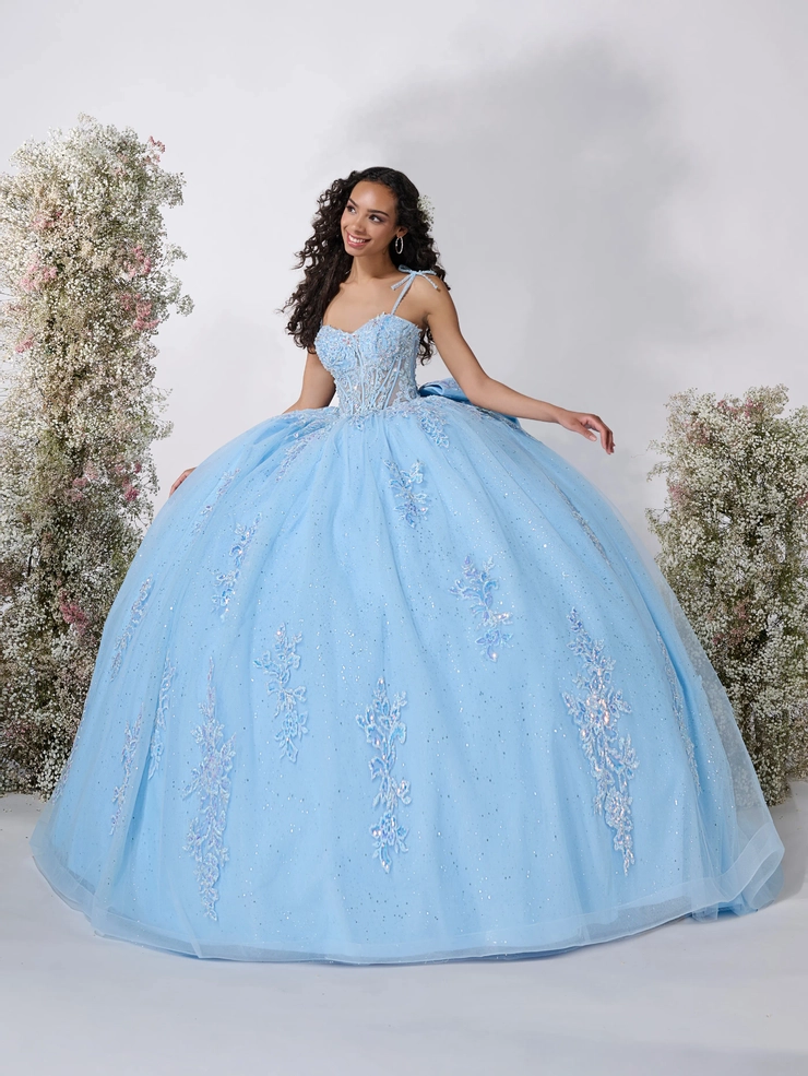 This dreamy ball gown features a flattering Basque waist that enhances the silhouette, paired with a structured corset bodice adorned with shimmering floral appliqués. Delicate shoulder bows add a romantic and on-trend touch, perfectly complementing the voluminous glitter tulle skirt for an ethereal princess look. Tulle/Glitter Tulle