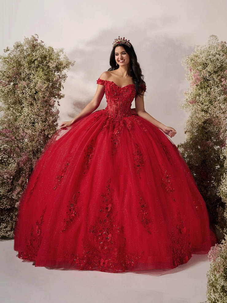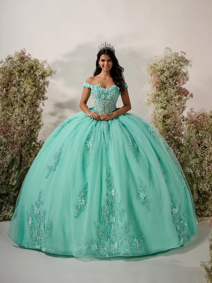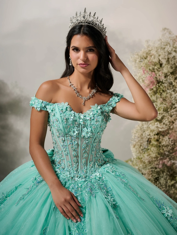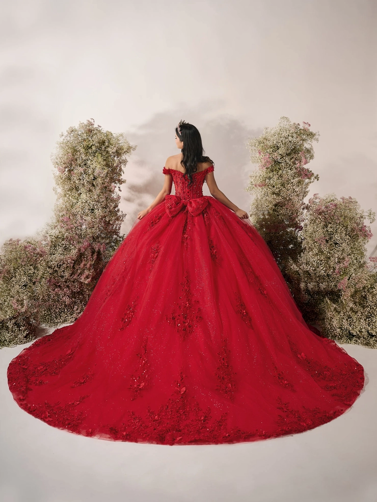 Command attention in this breathtaking ball gown, featuring a structured corset bodice with intricate floral embellishments and a romantic off-the-shoulder neckline. A dramatic train and a removable oversized bow add a regal finishing touch, making every step a statement of elegance. Tulle/Sparkle Tulle