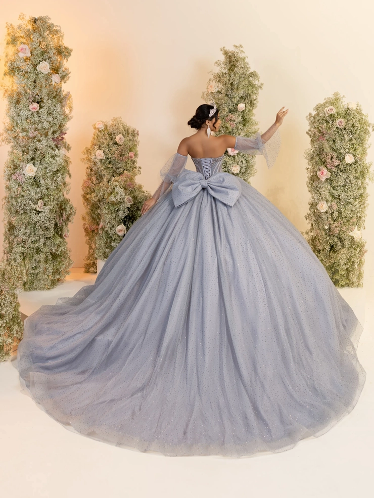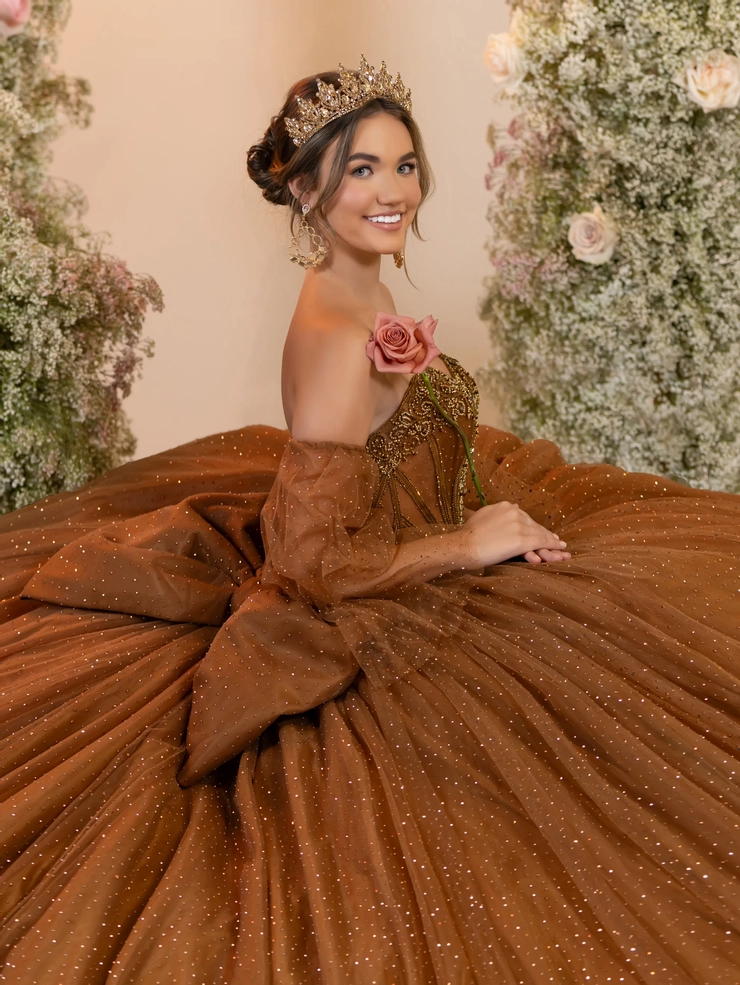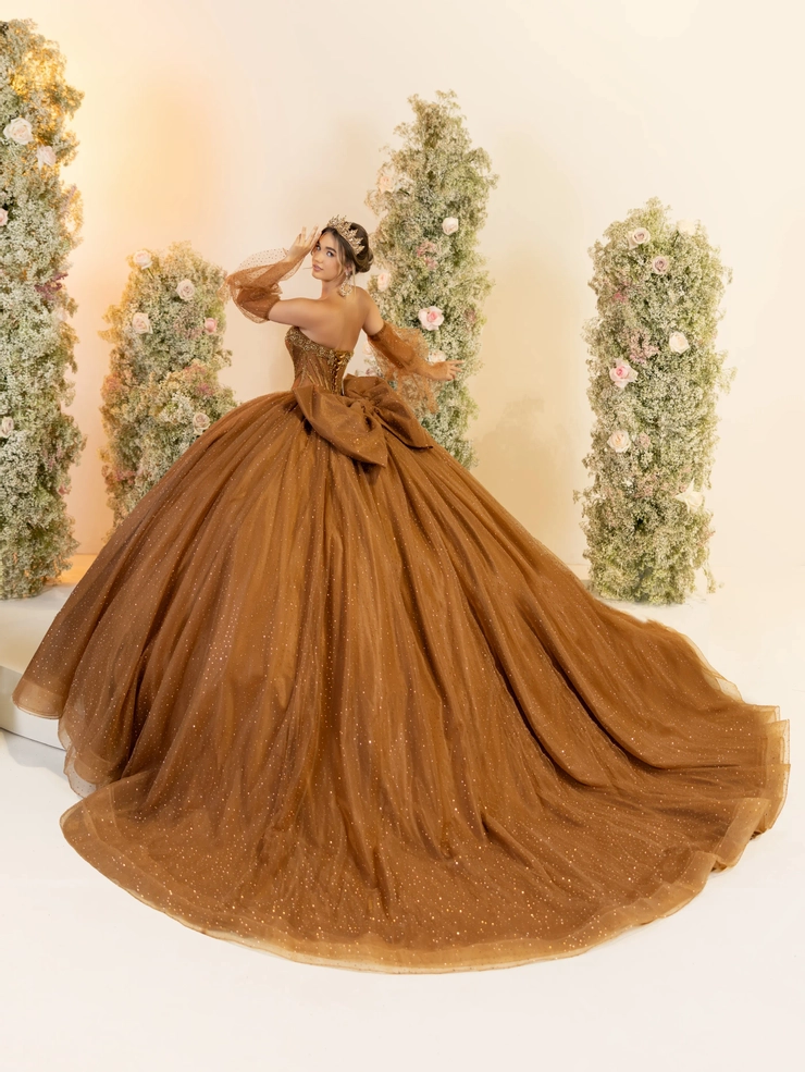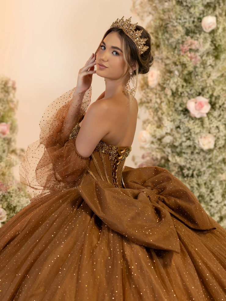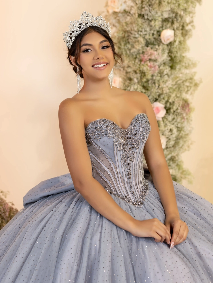 Strapless sweetheart beaded bodice with a corset-style structured bodice, full sparkling tulle skirt with headset stones throughout this horsehair edging chapel train.