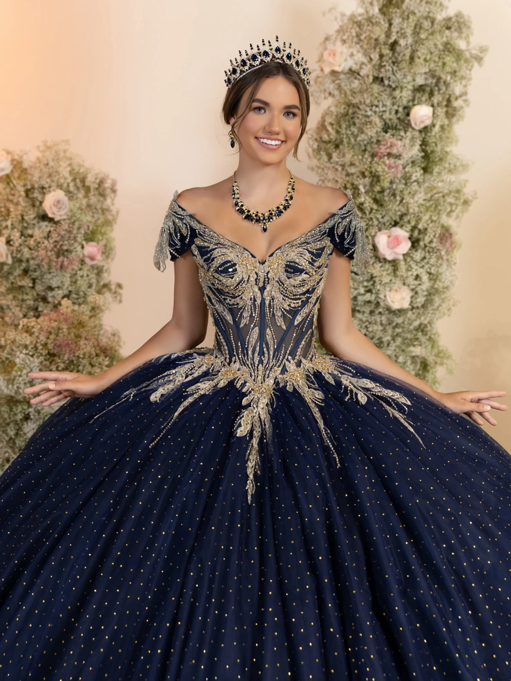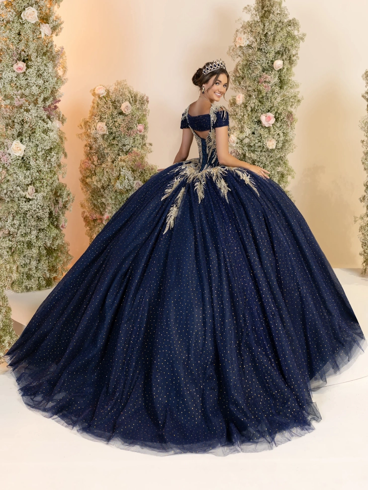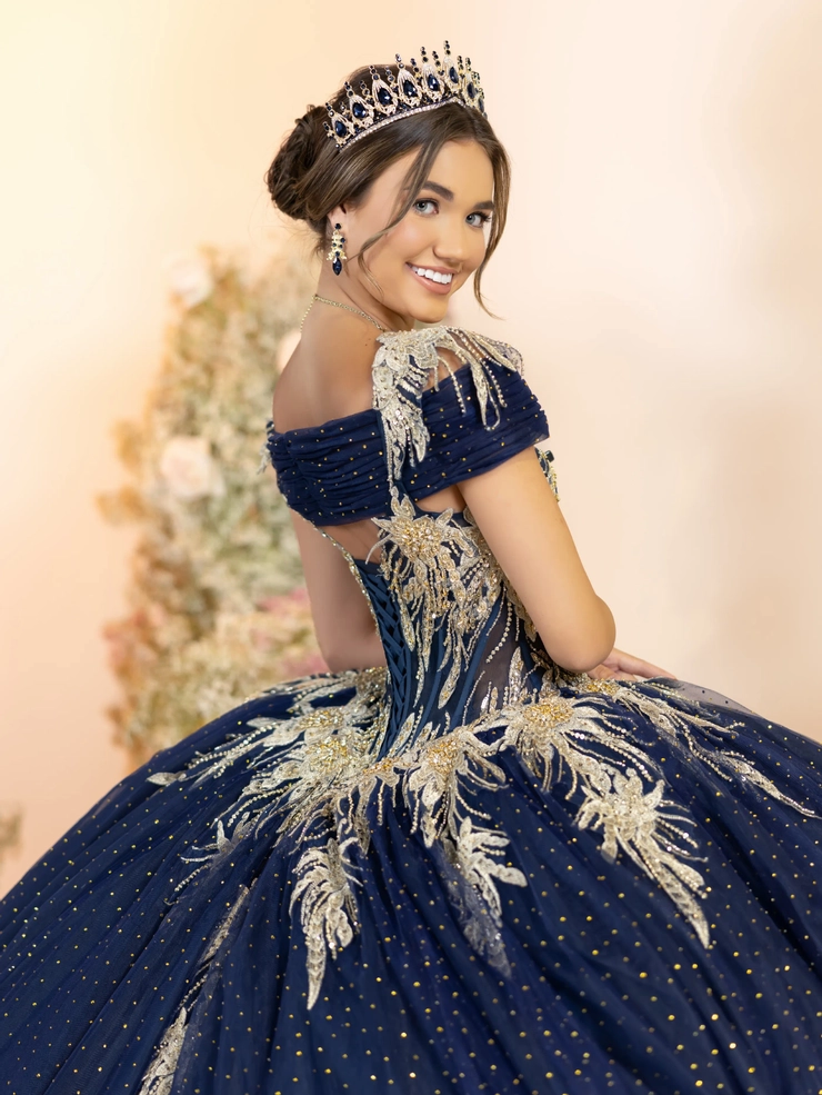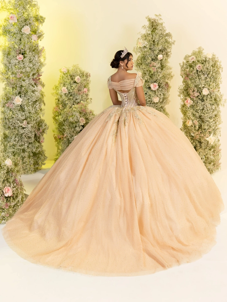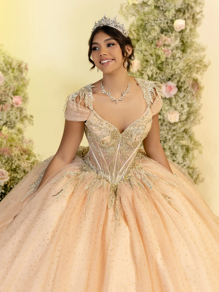 Sweetheart neckline tank top paired with a detachable off-the-shoulder shawl, structured corset sheer bodice with full heatset stones tulle skirt at chapel train length.