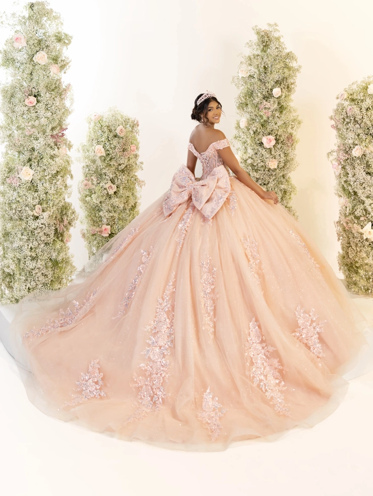 Off-the-shoulder portrait neckline embellished with embroidery beaded lace on a structured sheer bodice, vertical panels intricate matching embroidery lace scatter throughout out the chapel tulle skirt train.