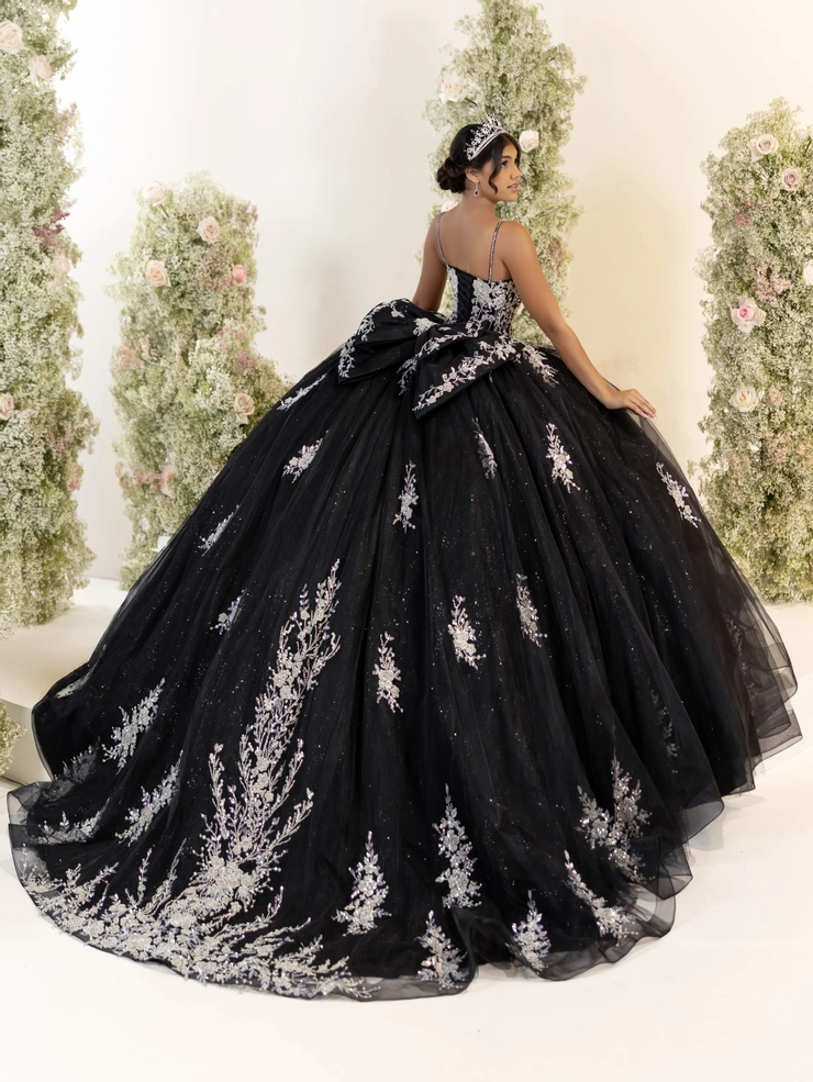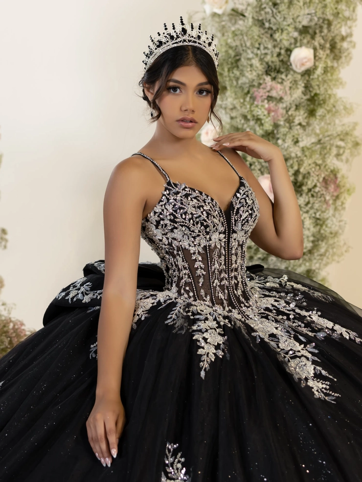 Spaghetti straps sweetheart neckline embellished with beaded embroidery lace fitted corset style sheer bodice, matching embroidery lace appliques throughout the voluminous chapel length tulle skirt.