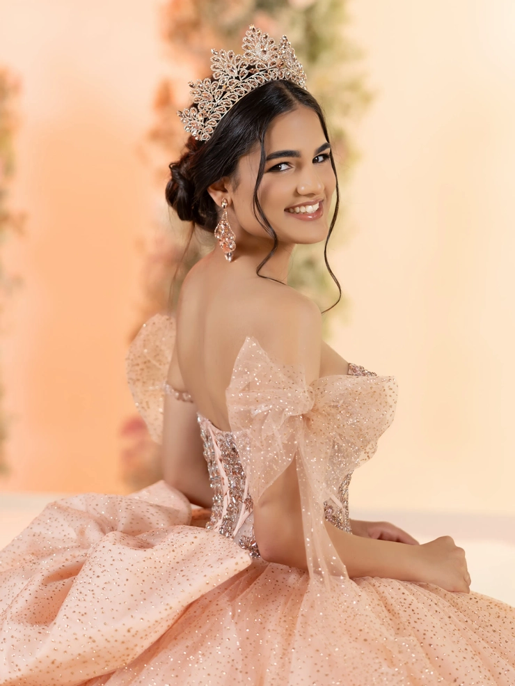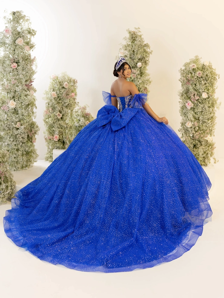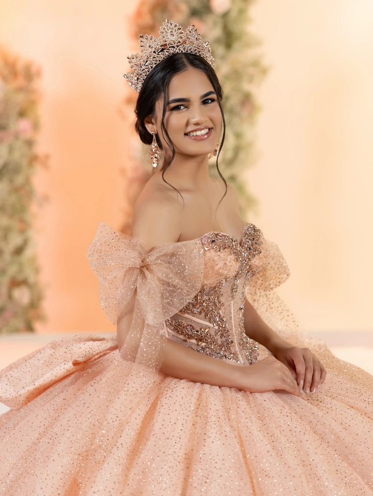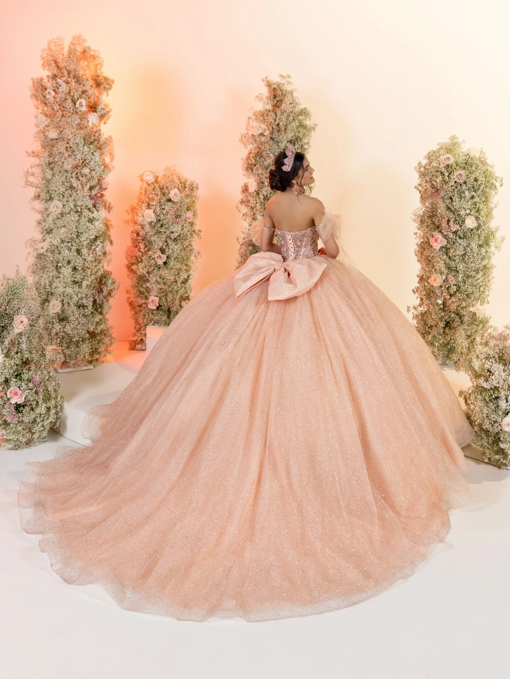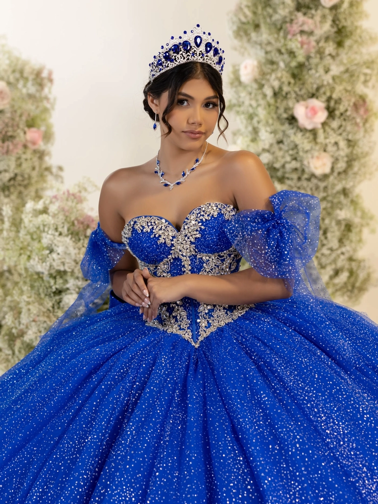 Off-the-shoulder scoop neckline embellished with gold embroidery beaded lace on a structured bodice, scatter linear lace appliques from waistline matching with the hem line vertical lace appliques, heatset stone on this chapel length tulle skirt.