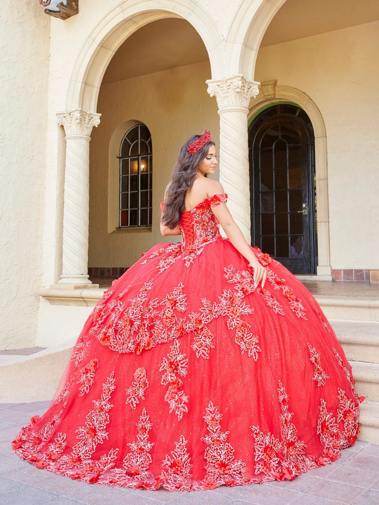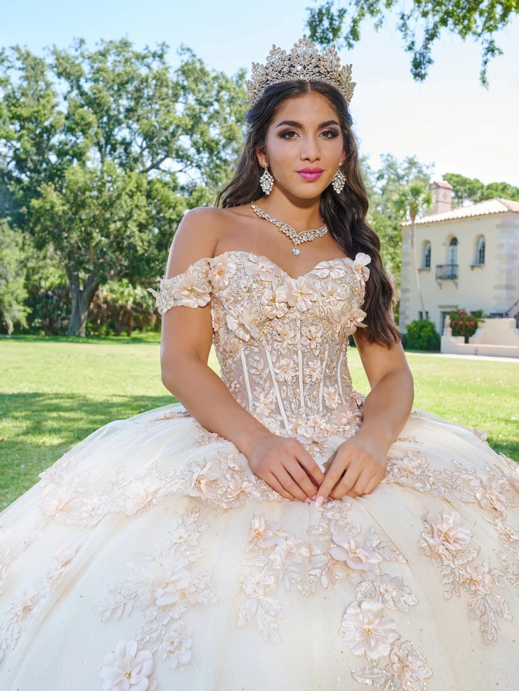 Sweetheart neckline with off shoulder corset Illusion bodice and lace appliques. Ruffle layer top with lace border hem with ball gown skirt. Lace-up back and petal detachable sheer train.