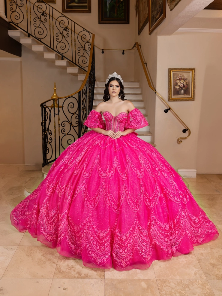 This stunning quince gown boasts a timeless sweetheart neckline embellished with shimmering details, three-quarter detachable puff sleeves are added to create volume. The full ball gown features a stunning lace applique pattern fit for a princess, while the back train delivers a cascade of ruffles. To complete this look a gorgeous back bow is added. Floral Glitter Tulle