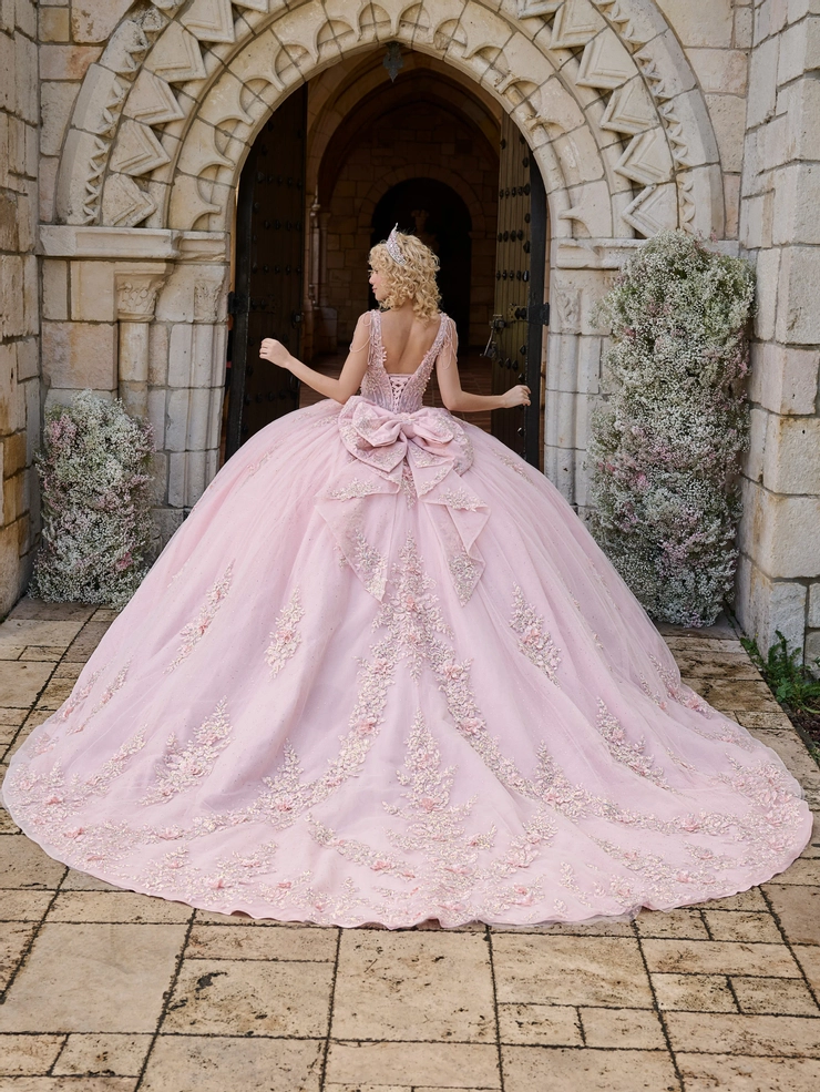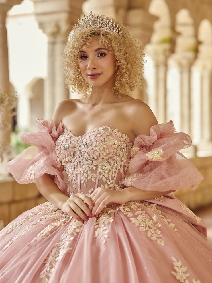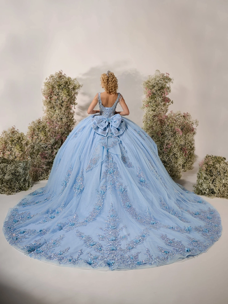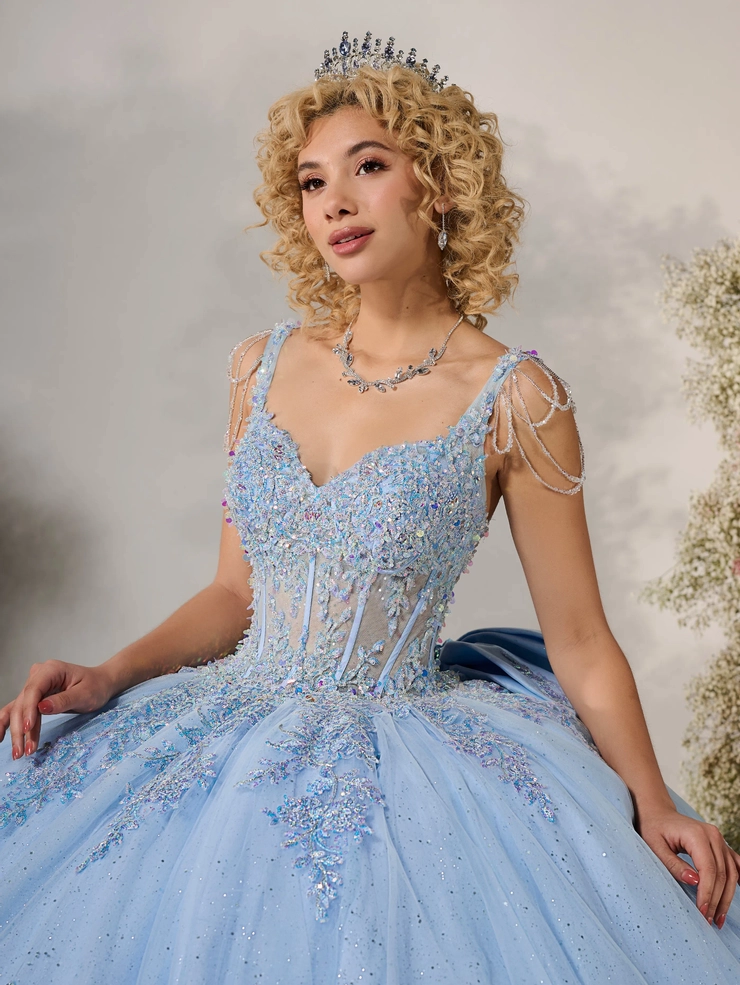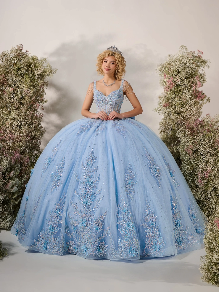 A dazzling ball gown fit for royalty, adorned with shimmering glitter tulle and exquisite border lace for a grand, regal effect. Delicate beaded shoulder swags drape elegantly, adding an ethereal touch to the structured corset bodice. The voluminous skirt cascades into a breathtaking display of embroidered florals, perfect for a fairytale entrance. Tulle/Glitter Tulle