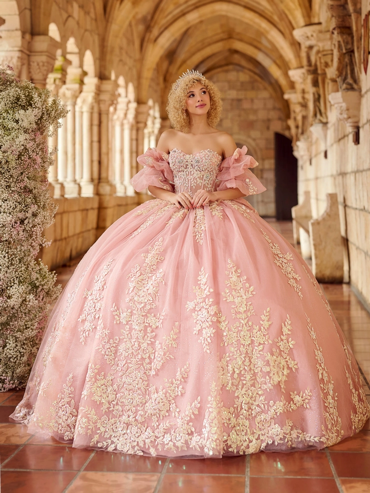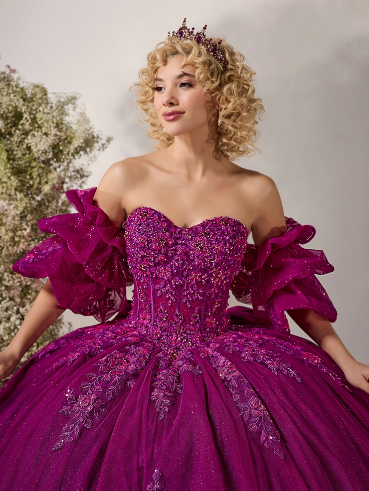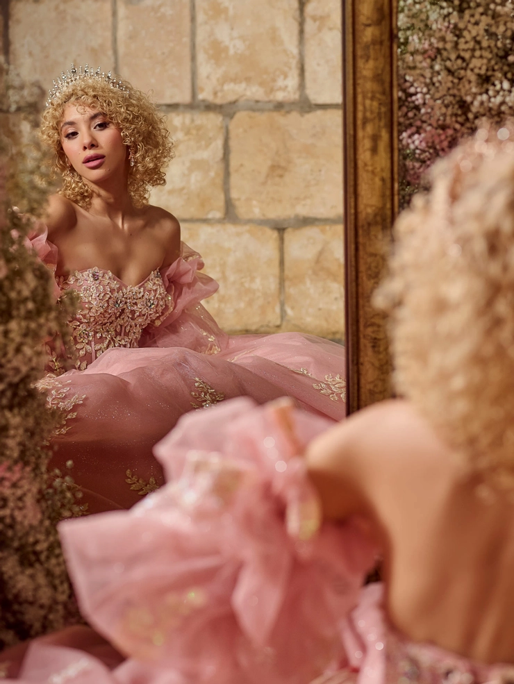 Exuding regal elegance, the gown features separate tiered sleeves that add a touch of drama and romance. A breathtaking long train cascades behind, while a detachable back bow enhances the grandeur of the silhouette, making every step a statement. Tulle/Sparkle Tulle
