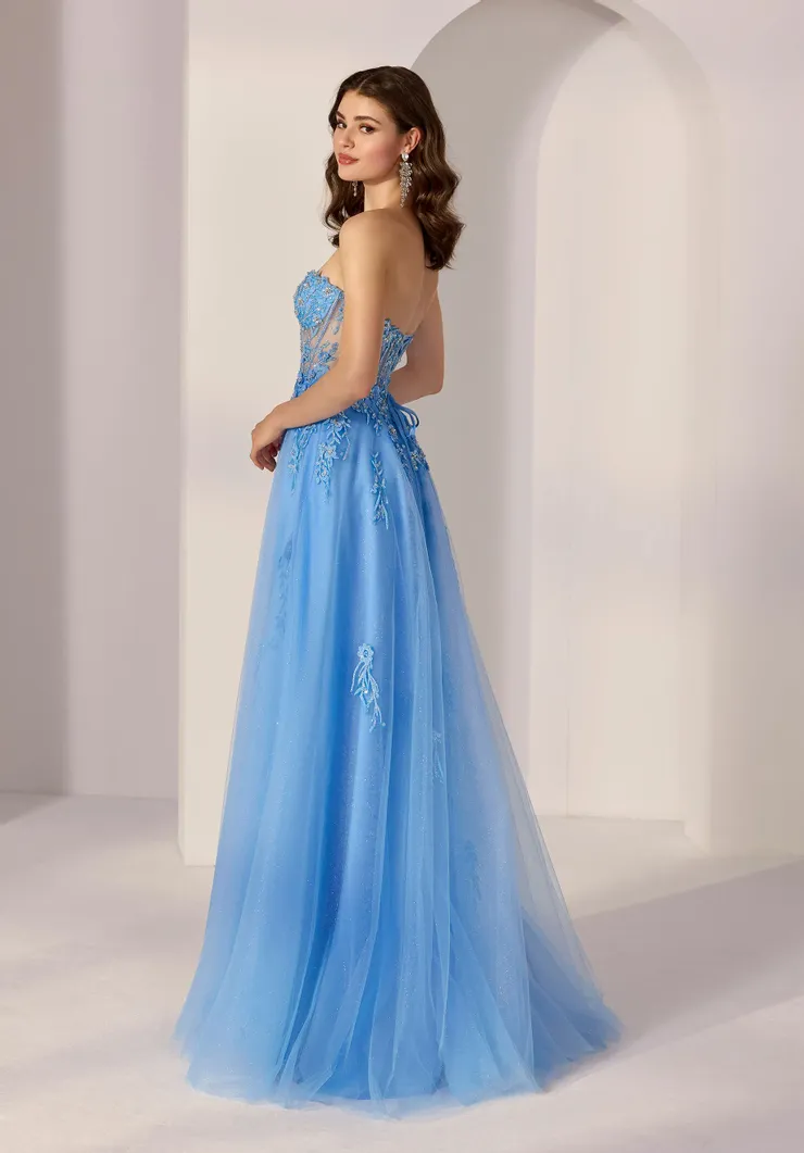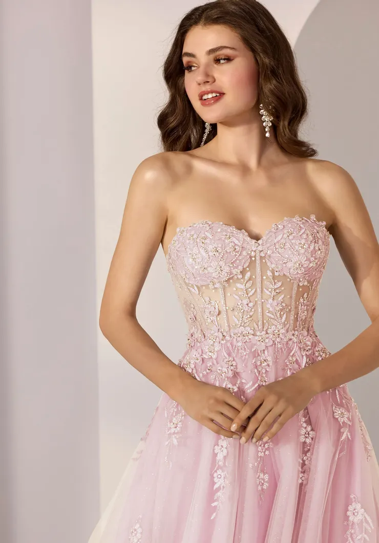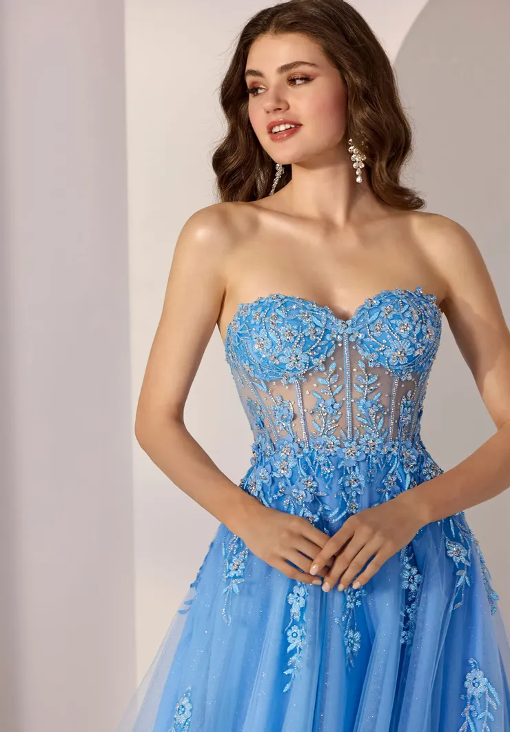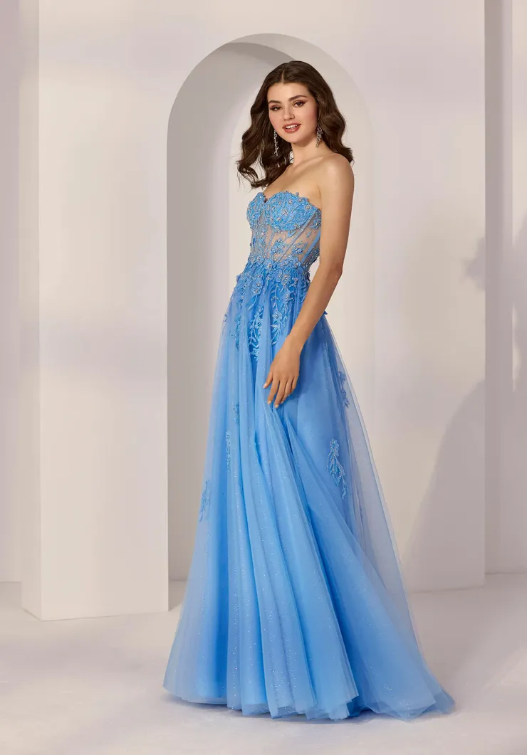 Delicate yet striking, this glitter tulle A-line dress is made to shine. The strapless sweetheart neckline and sheer corset bodice sculpt with ease, while cascading crystal beaded floral appliqués bring shimmer and movement meant for making a memorable entrance.