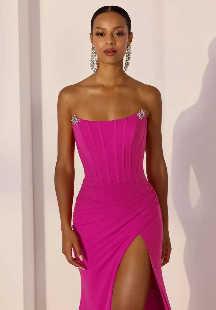 Sleek, sculpted, and sparkling in all the right places. This sheath party dress features a strapless scoop neckline with structured boning and crystal brooch accents, for a touch of sparkle. The draped matte jersey skirt, with its thigh-high slit, creates a statuesque silhouette for a gown that epitomizes understated glamour.