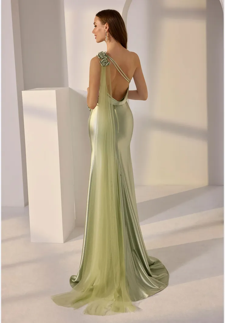 The ultimate eye-catcher, this fit and flare party dress features an asymmetric one-shoulder neckline that leads to rosette details and an ethereal tulle drape that flows behind you. The draped cowl back adds soft elegance, while 3D rosettes accents define the waist and a skirt slit creates more movement for a look that feels both romantic and strikingly contemporary.