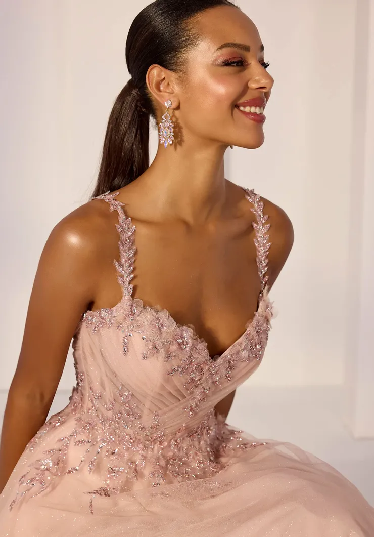 Step into enchanting glamour with this glitter tulle ball gown party dress. The sheer ruched bodice is adorned with delicate floral glitter details, while a lace-up corset back sculpts the waist for a flawless fit. The full A-line skirt flows effortlessly with sparkling layers of tulle, creating a dreamy, statement-making silhouette perfect for moments where you want to shine.